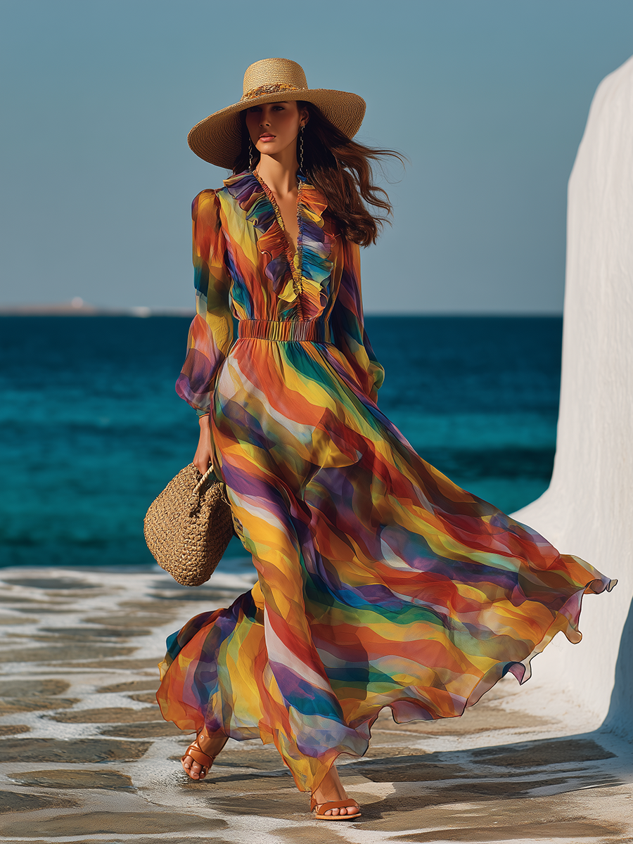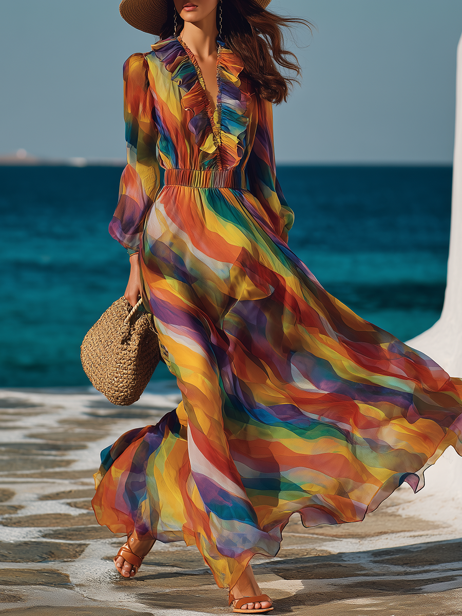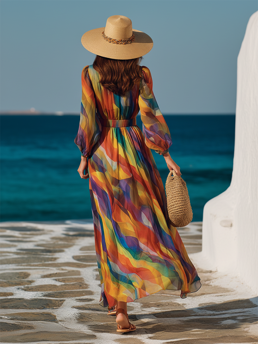 This rainbow printed chiffon dress is absolutely breathtaking! The pattern looks like wearing a sunset, and the skirt sways as if kissed by a gentle breeze when you move—so ethereal and graceful. Whoever wears it becomes an instant fairy. ✨