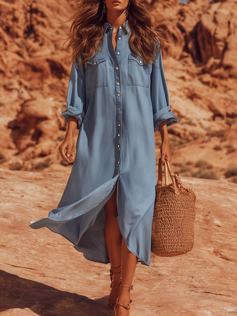 Loose Bohemian Denim Shirt Maxi Dress