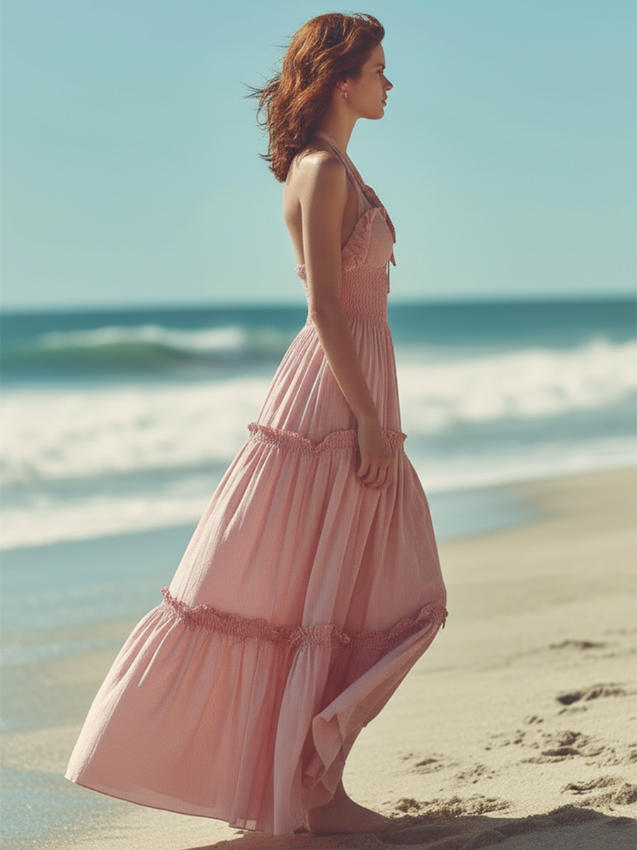 Beach Resort Style Halter-neck Sleeveless Pink Cotton Maxi Dress