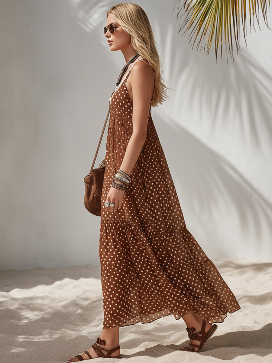 Bohemian Resort Brown Chiffon White Polka Dot Lace Trim Maxi Dress