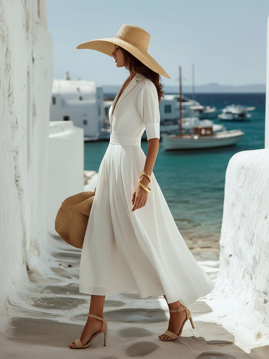 Elegant Vacation Short-sleeved A-line White Cotton And Linen Maxi Dress
