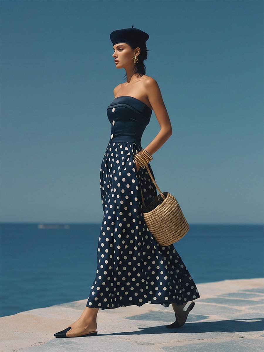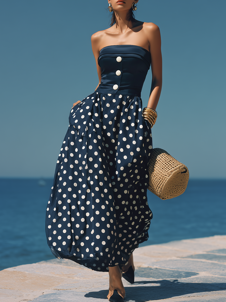 Stylish Nautical-inspired White Polka Dot Dark Blue Satin Maxi Dress