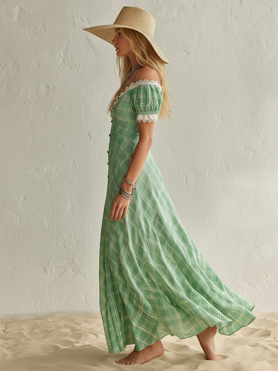 Bohemian Romantic Green Plaid Off-Shoulder Lace-Trimmed Button Midi Dress