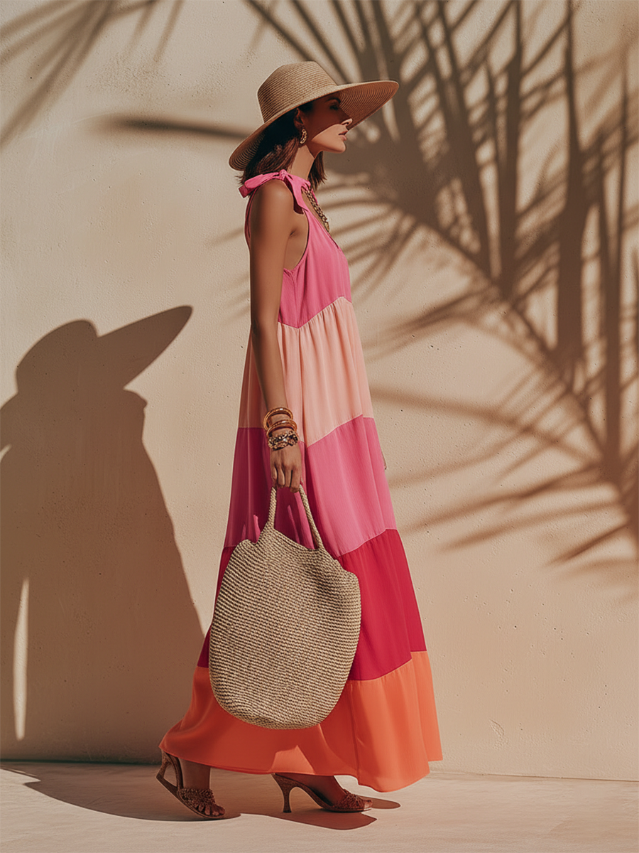 Colorful Vacation-style Patchwork Shoulder Bow Tie Straps Maxi Dress