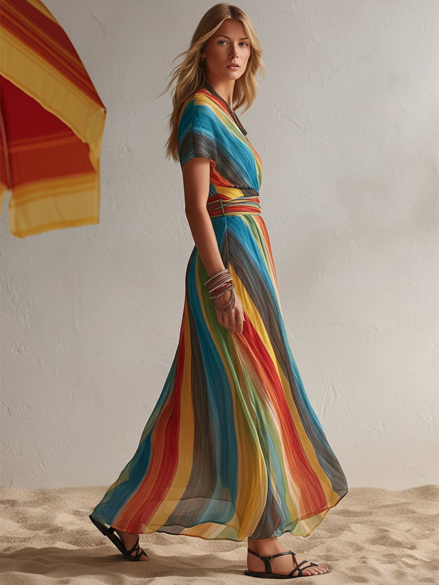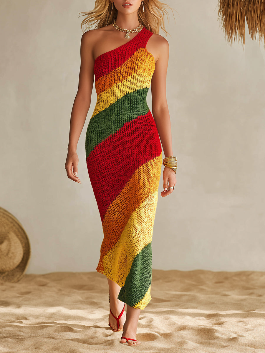 Bohemian Resort Rainbow Striped Chiffon One-Shoulder Maxi Dress