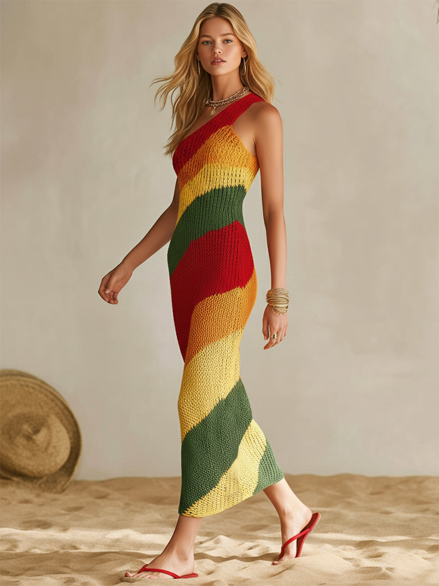 Bohemian Resort Rainbow Striped Knit Off-Shoulder Sleeveless Midi Dress