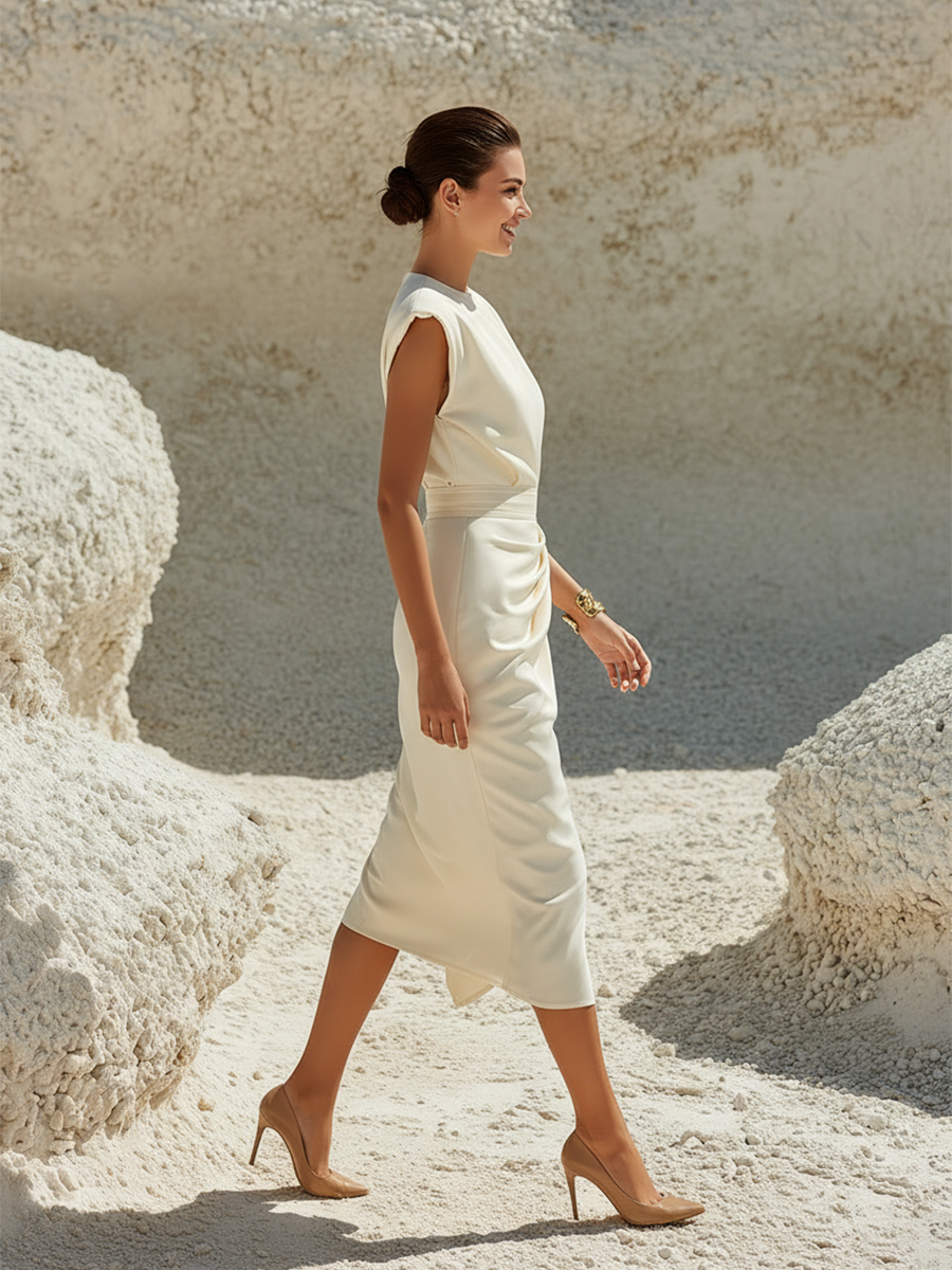 Elegant And Sophisticated Wide-shouldered Sleeveless White Pleated Midi Dress