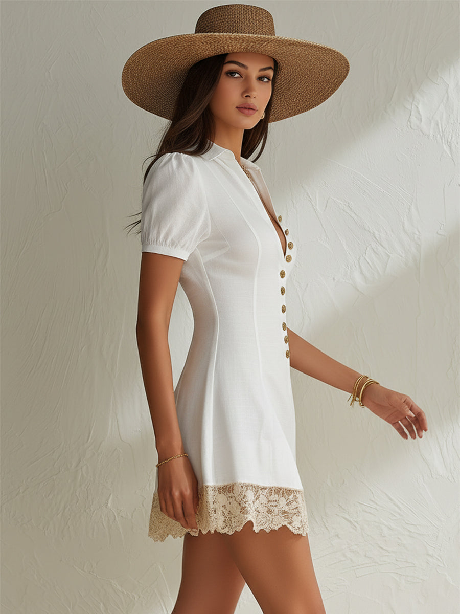 Fashionable Bohemian White Cotton Linen Button-Up Lace Trim Short-Sleeve Mini Dress