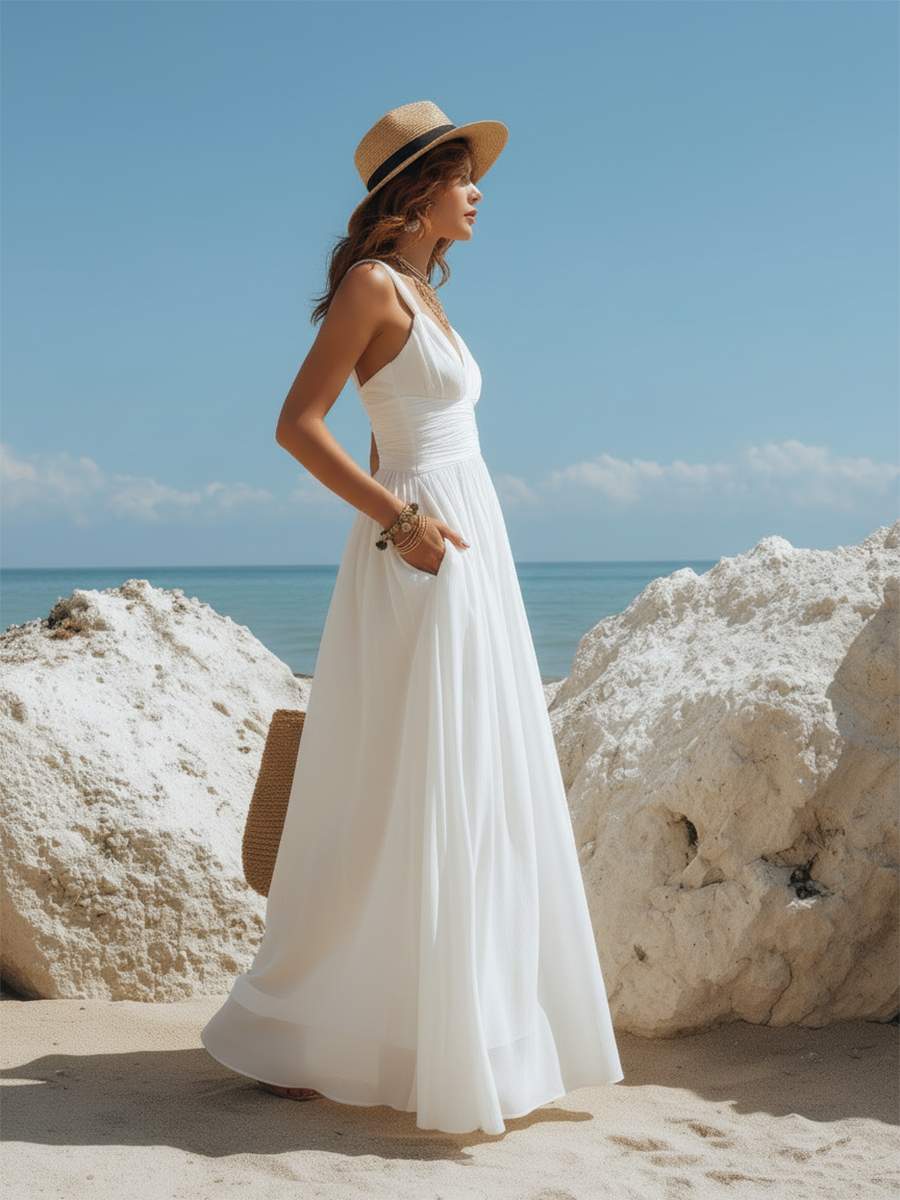 Resort-style White V-neck Sleeveless Slit Maxi Dress