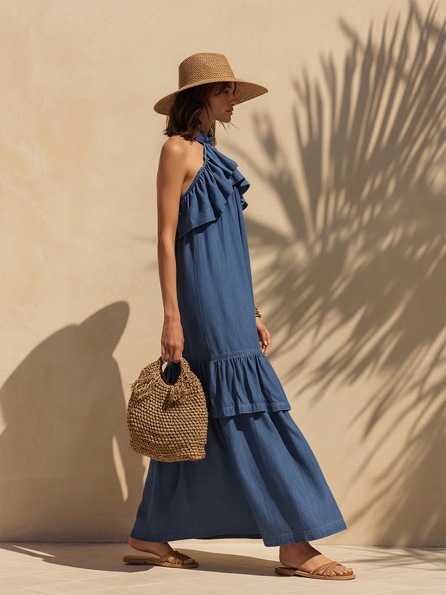 Elegant Bohemian Ruffled Sleeveless Denim Maxi Dress
