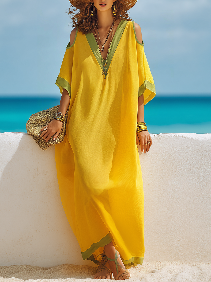 Resort-style V-neck Yellow Loose Short-sleeved Maxi Dress