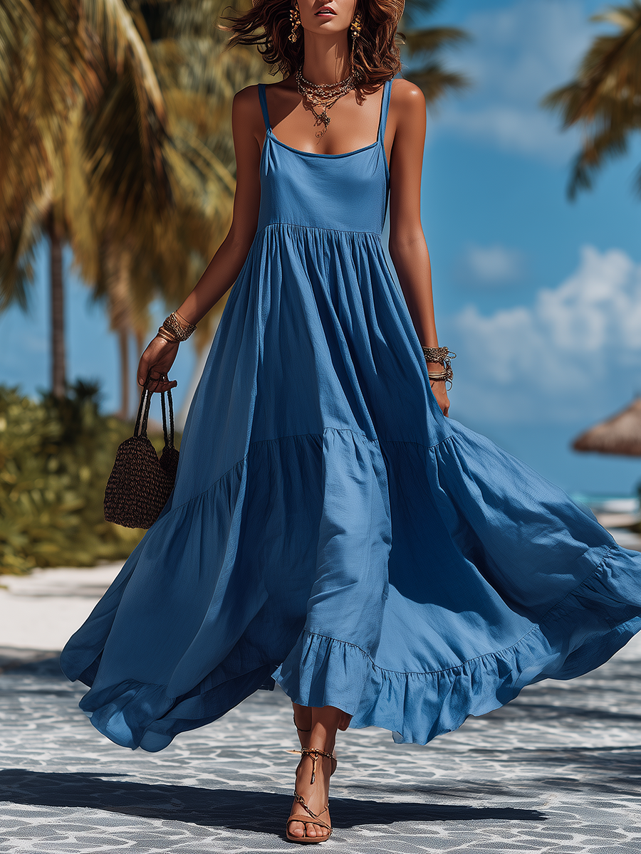 Vacation-Style Loose Blue Strappy Maxi Dress