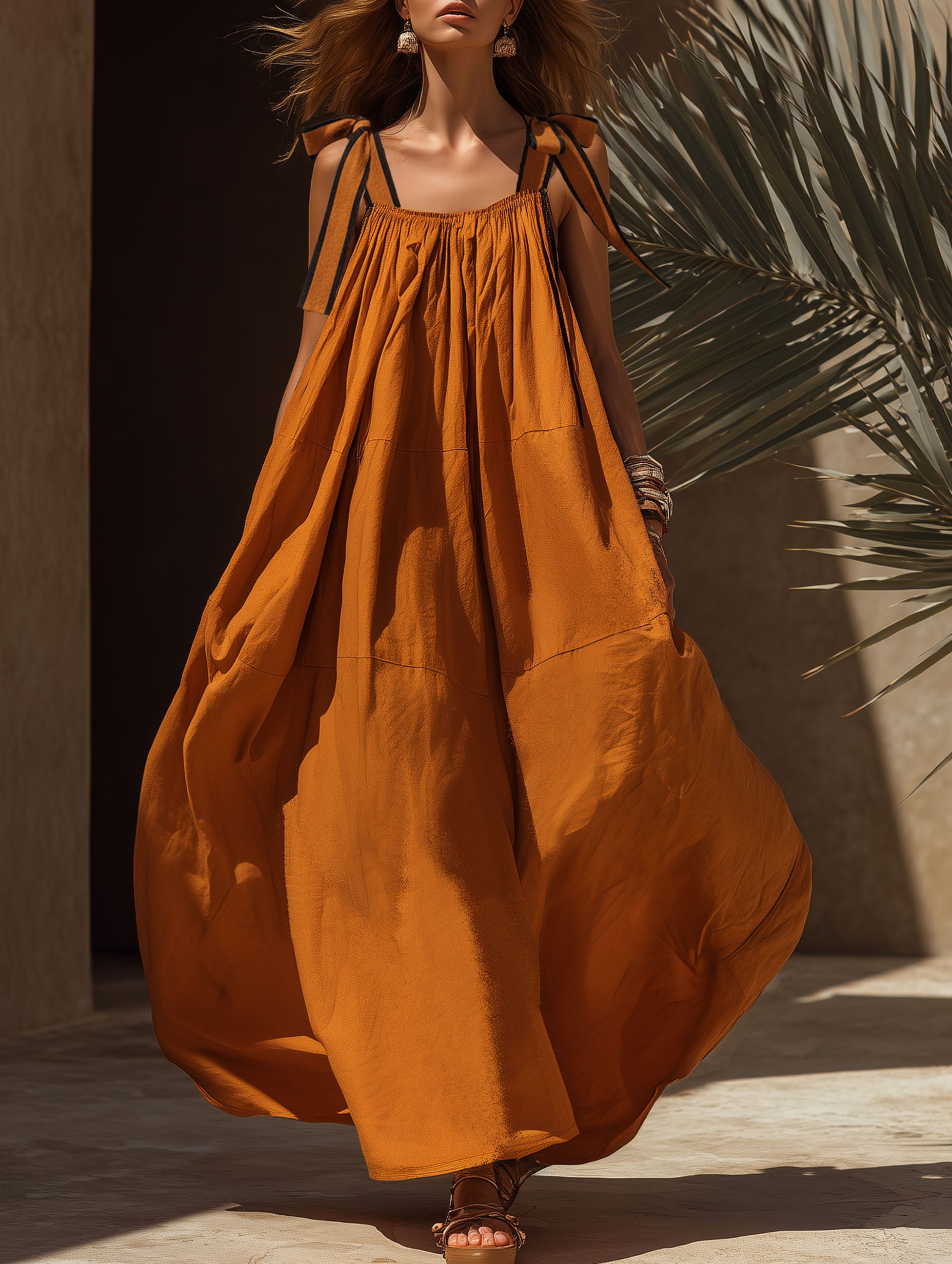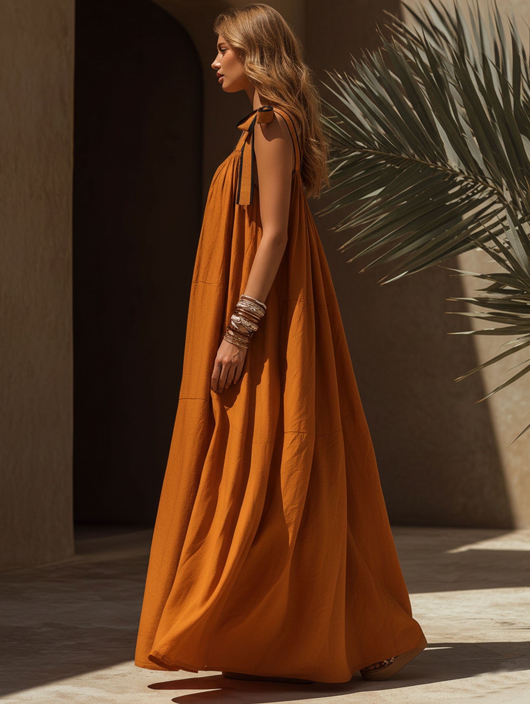 Elegant Orange Cotton Linen Bow Tie Maxi Dress