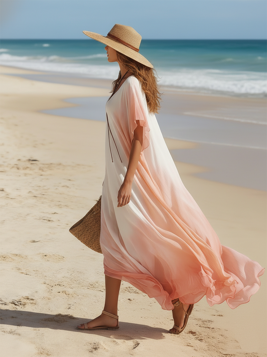 Resort-style White And Pink Gradient V-neck Short-sleeved Maxi Dress