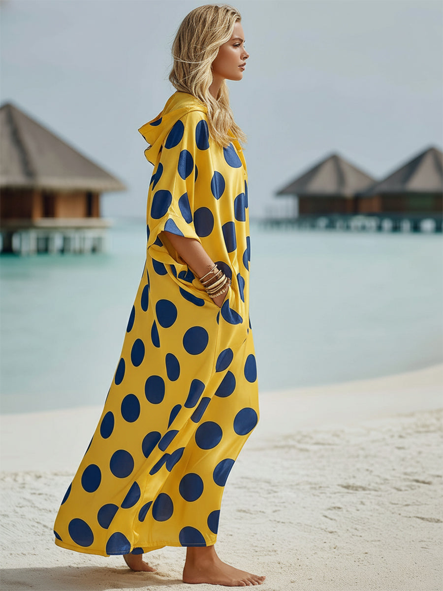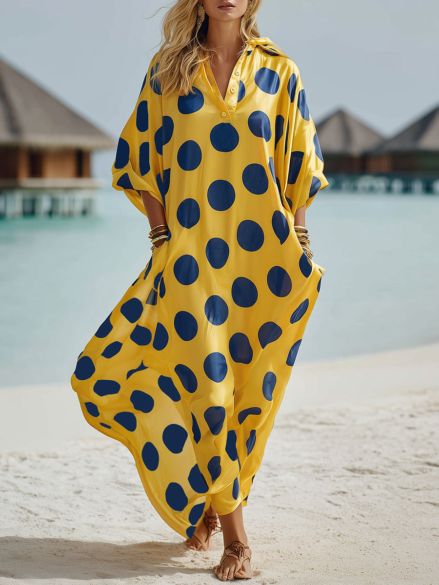 Bohemian Yellow Base With Navy Polka Dots Loose Batwing Sleeve Maxi Dress