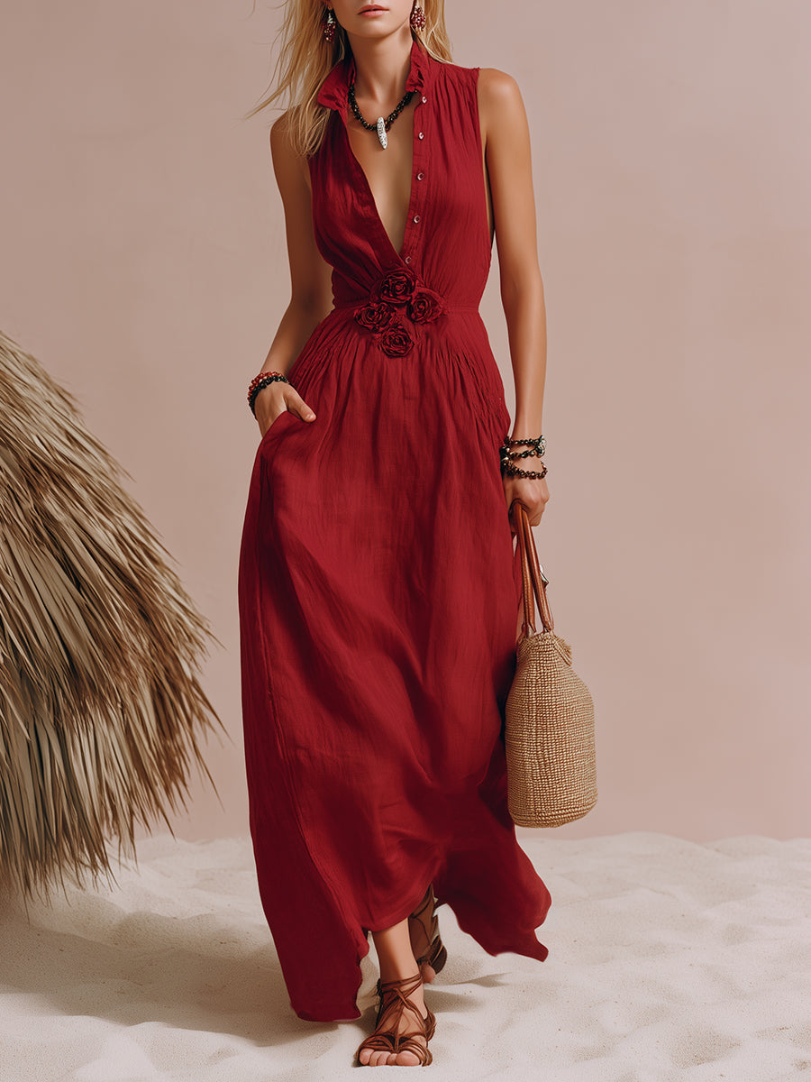 Bohemian Resort Style Floral Applique Red Cotton And Linen Sleeveless Maxi Dress