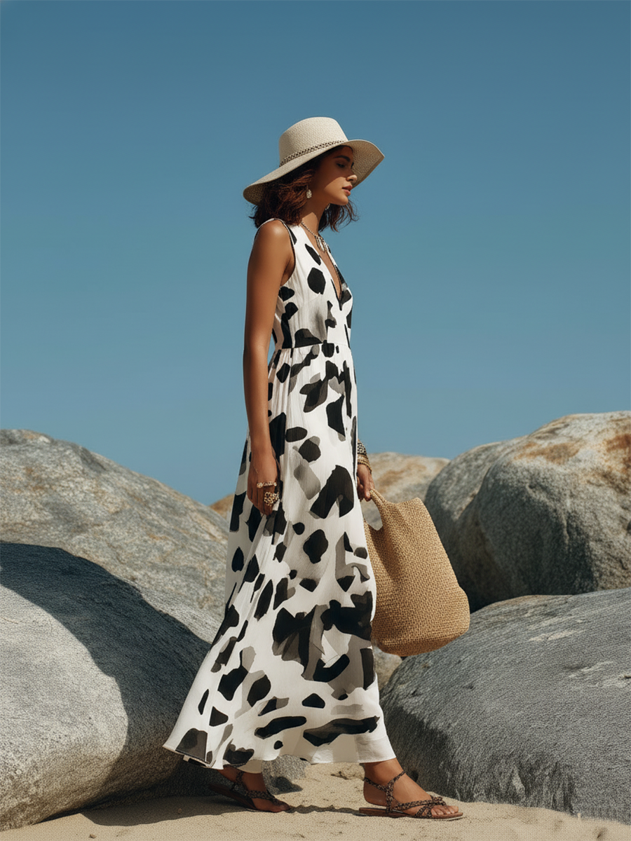 Vacation-Style Black And White Printed Sleeveless Maxi Dress