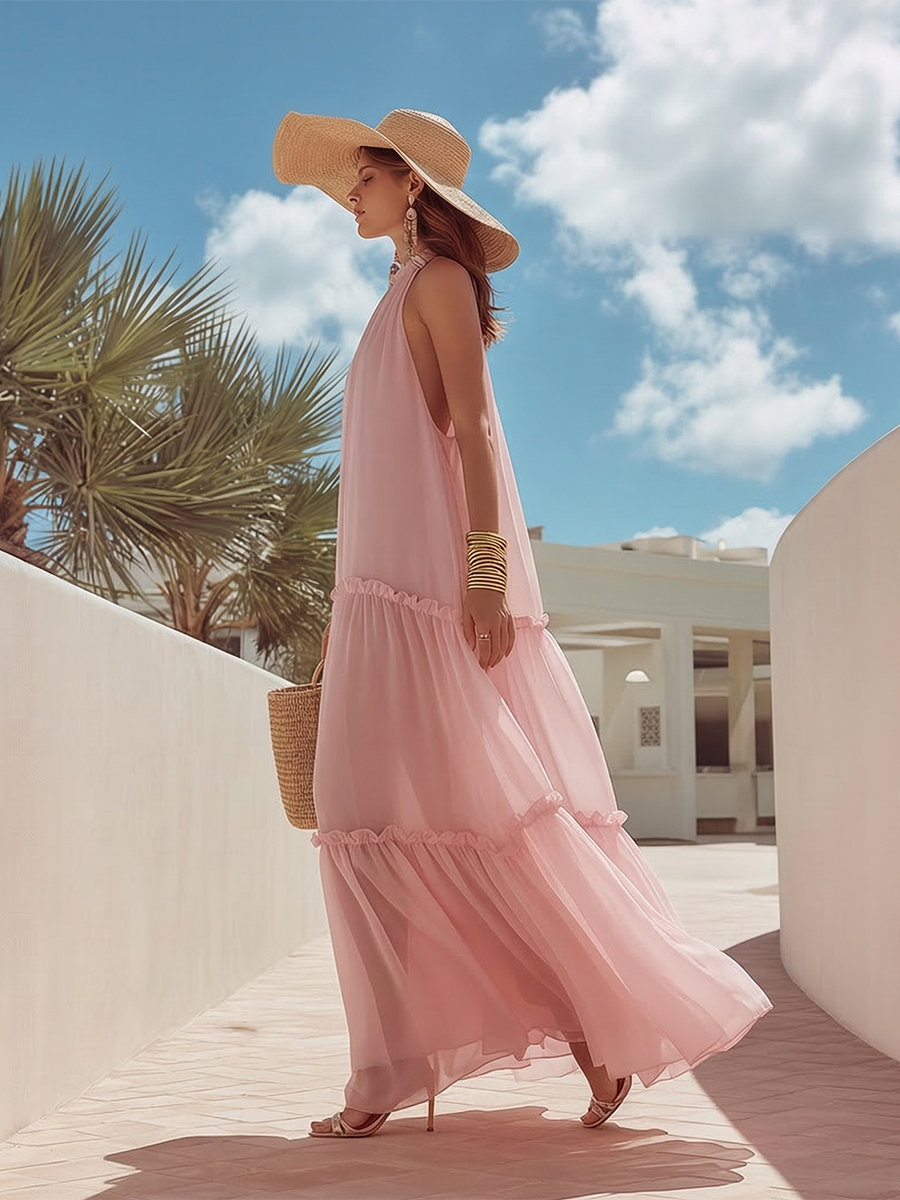 Romantic Vacation Pink Chiffon Ruffled Trim Sleeveless Maxi Dress