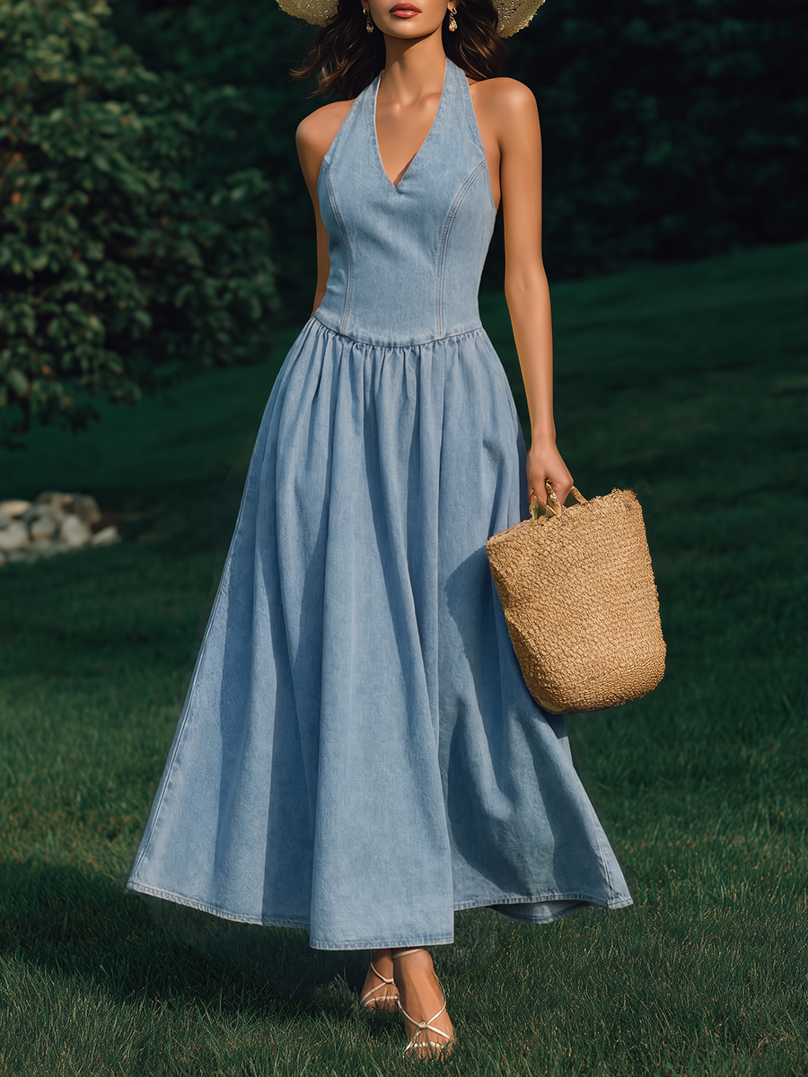 Minimalist Vacation V-neck Sleeveless Tencel Denim Maxi Dress