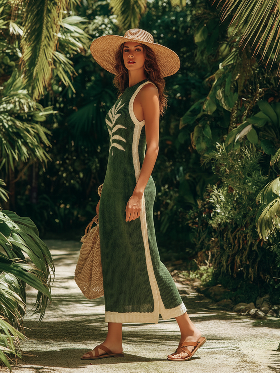 Relaxed Vacation Style Palm Leaf Pattern Green Sleeveless Knitted Maxi Dress