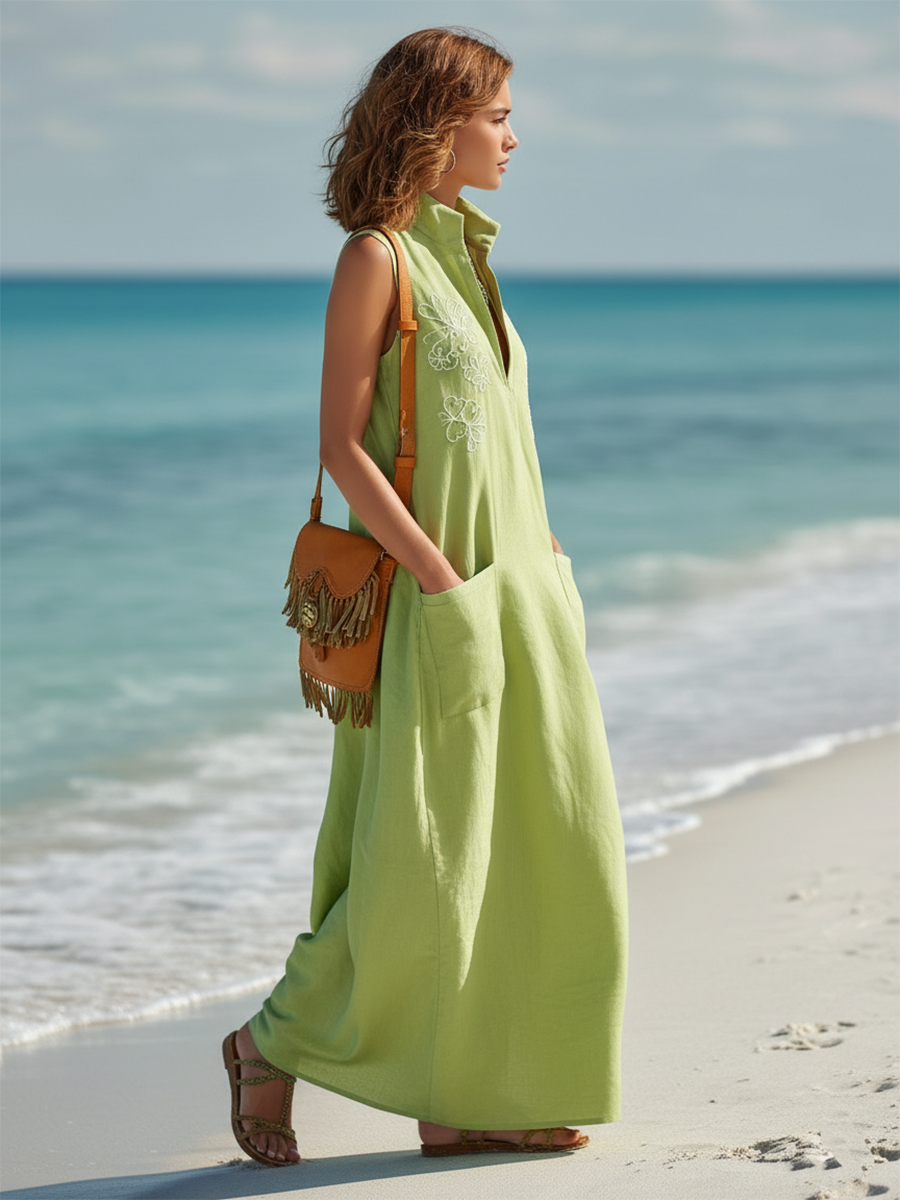 Resort-style Green V-neck Embroidered Loose Maxi Dress