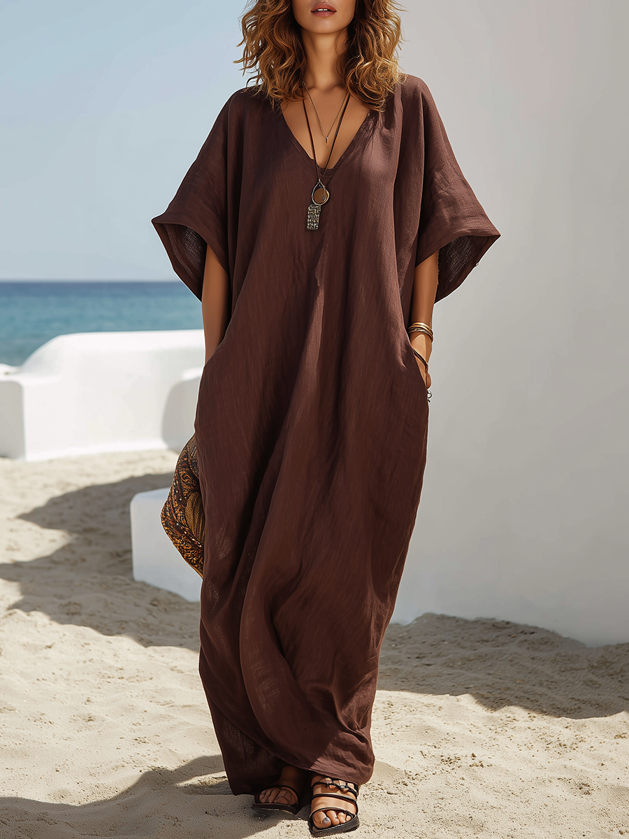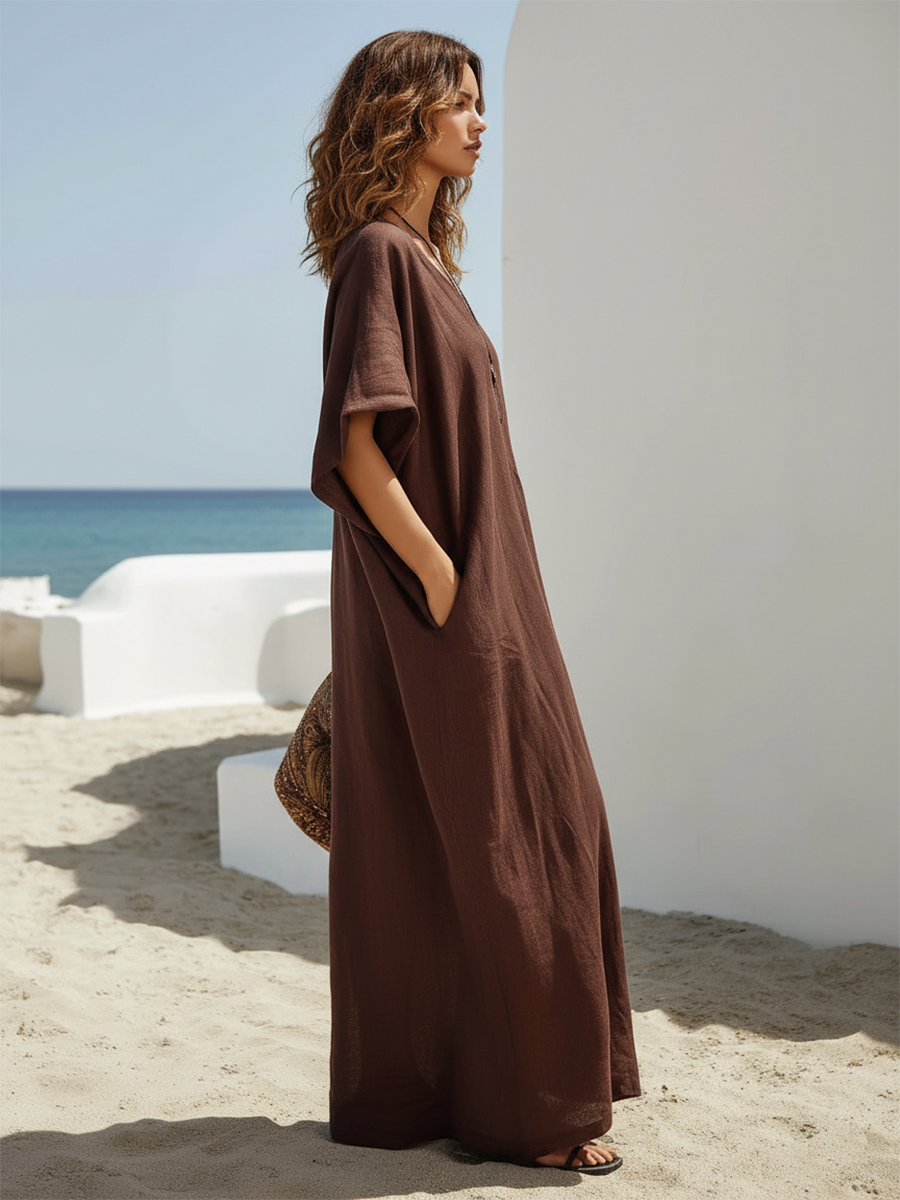 Resort-style Brown V-neck Short-sleeved Loose Maxi Dress