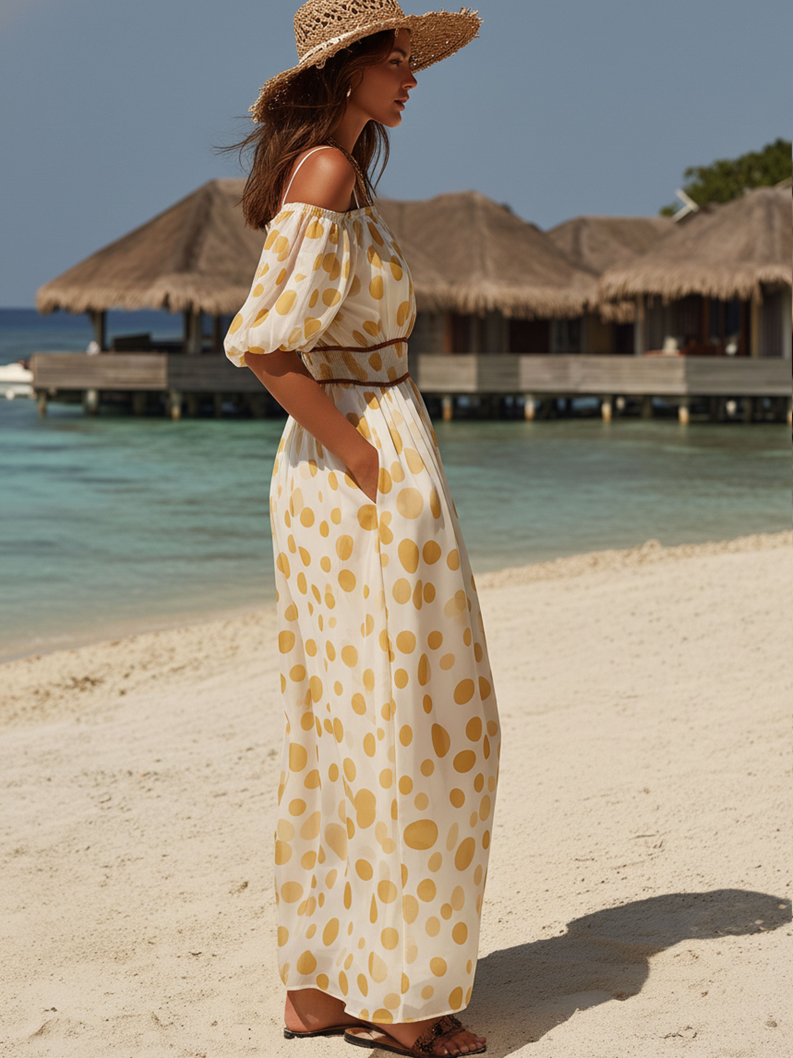 Resort-style Beige V-neck Short-sleeved Maxi Dress