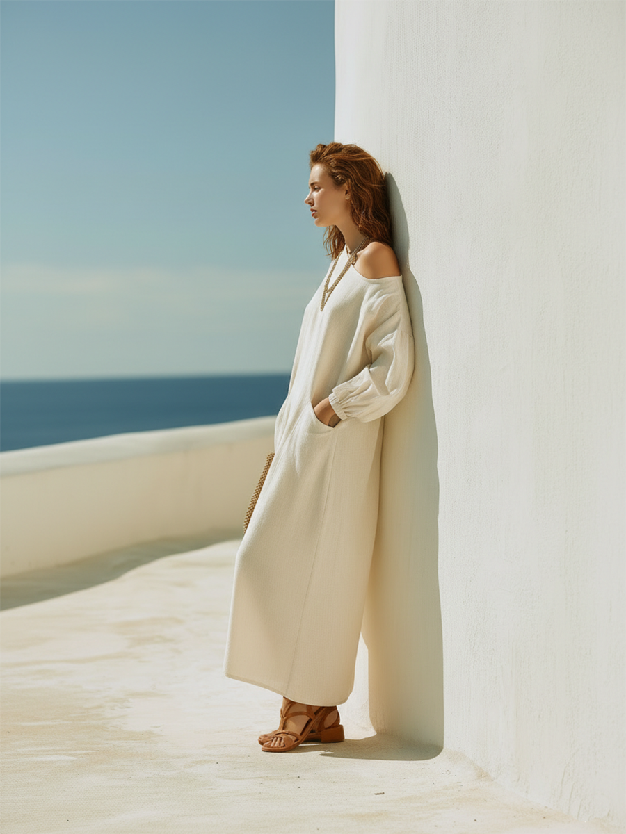 Resort-style White Off-shoulder Long-sleeved Maxi Dress