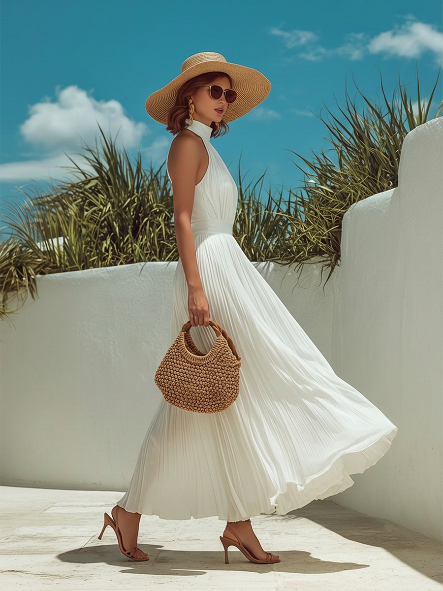 Chic And Elegant Sleeveless Pleated White Satin Maxi Dress
