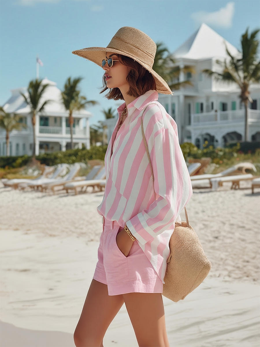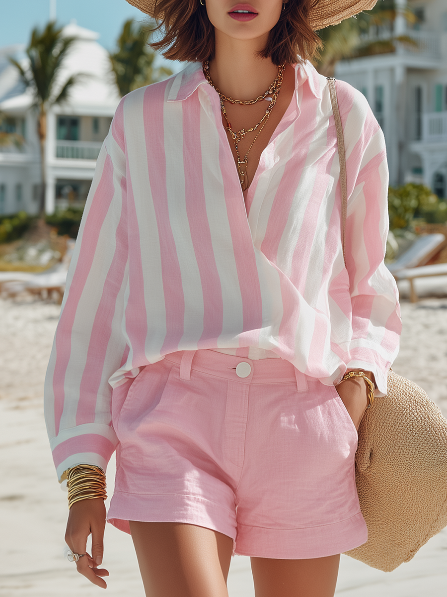 Casual Vacation Pink Cotton-linen Striped Long-sleeved Shirt And Shorts Set