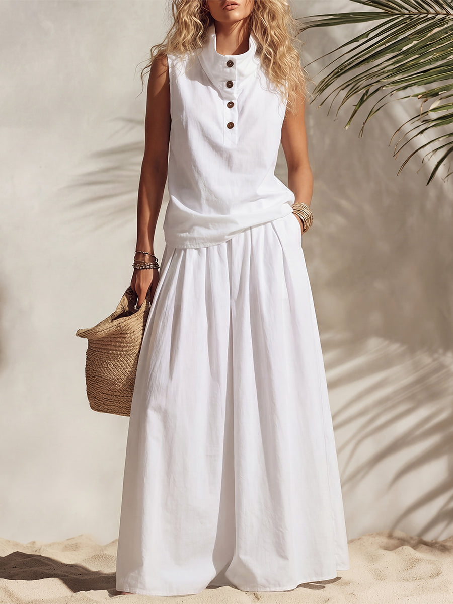 Casual Vacation White Sleeveless Turtleneck Button-down Top And High-waisted Loose Skirt Set