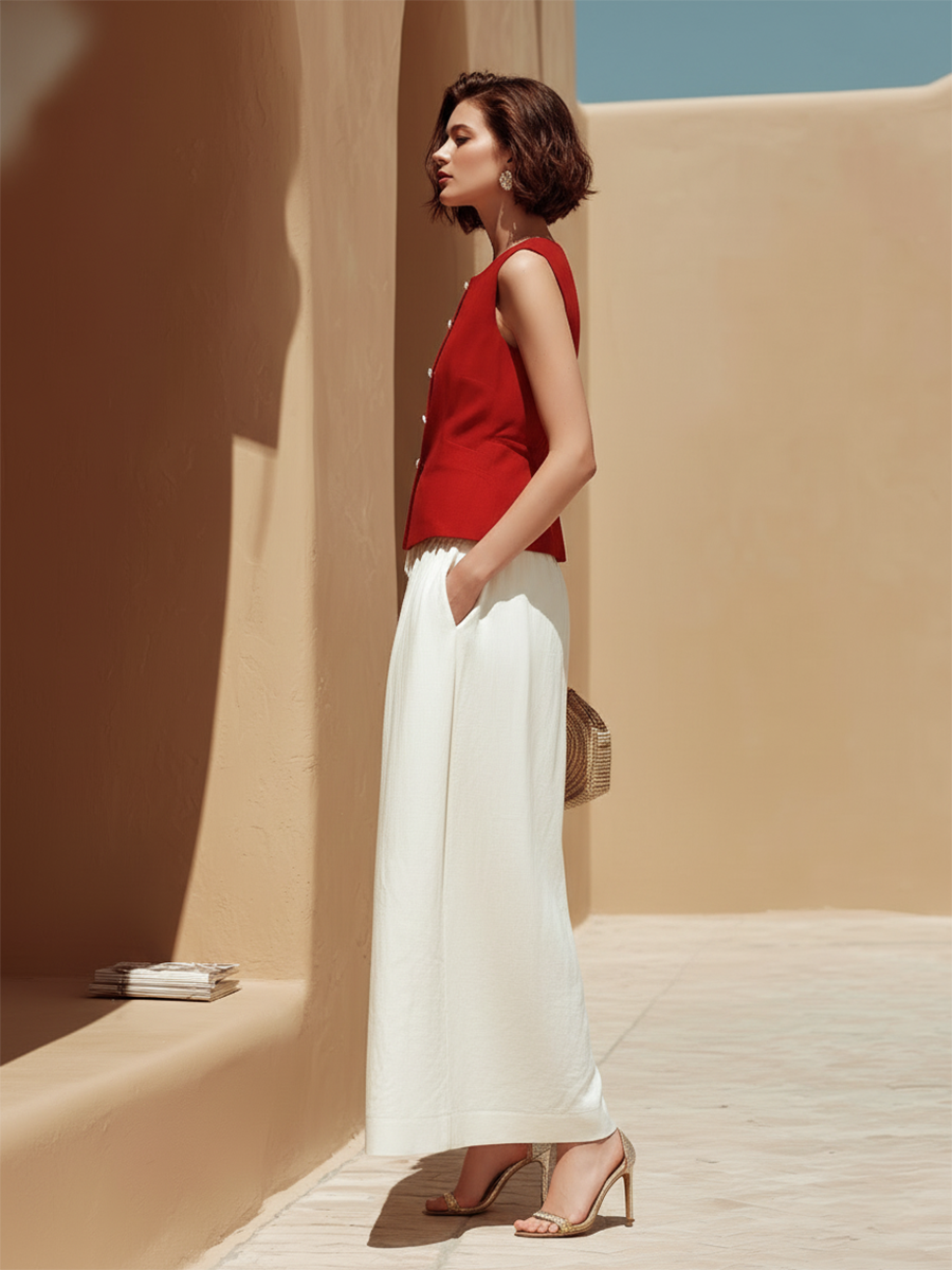 Minimalist And Sophisticated White Cotton And Linen One-shoulder Button-down Vest And Wide-leg Pants Set