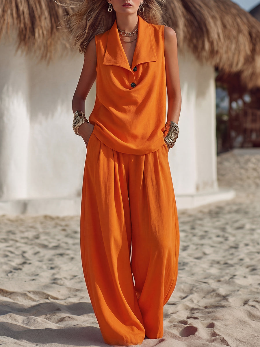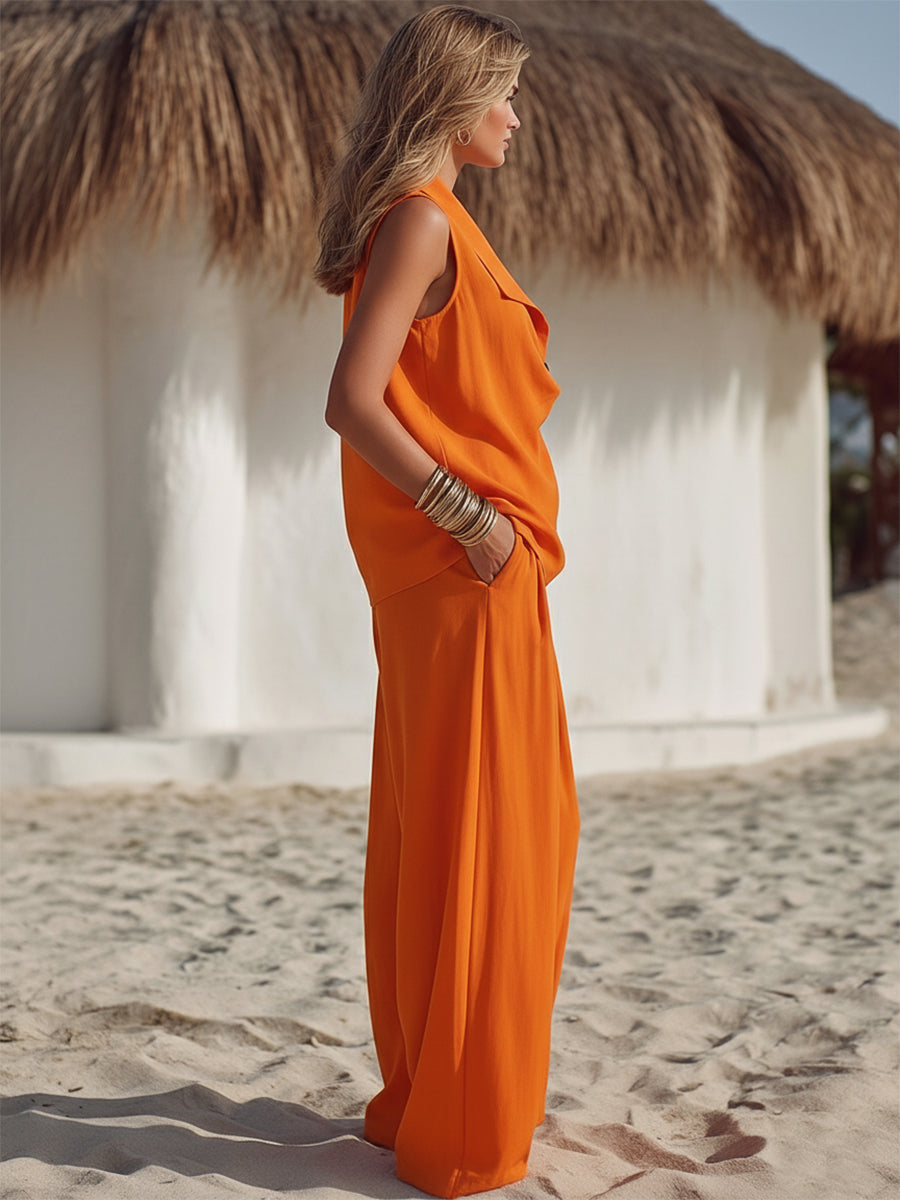Casual Resort Vibrant Orange Sleeveless Collared Top And Loose-fitting Trousers Set