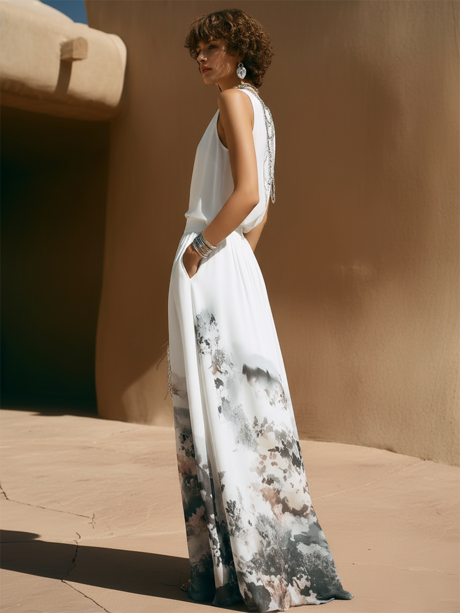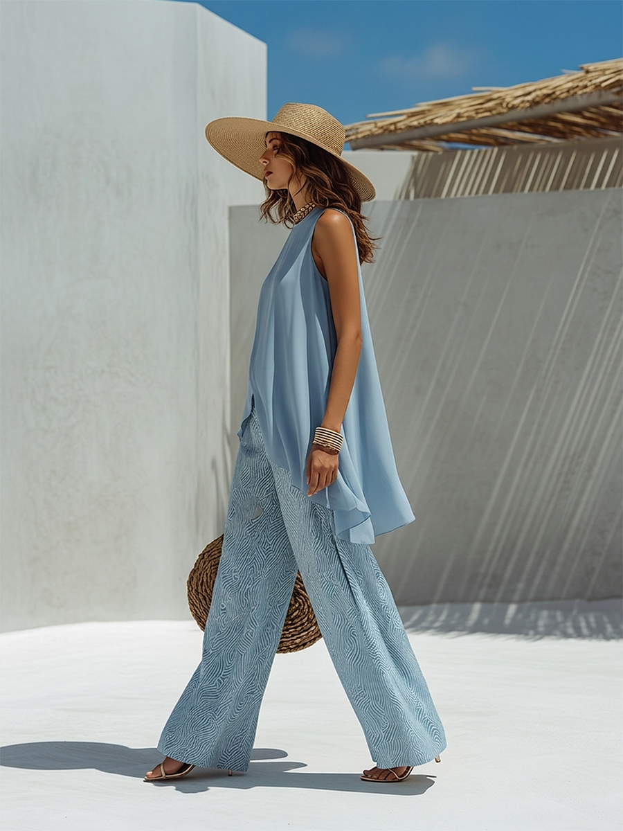 Vacation-Style Blue Chiffon Sleeveless Top And Printed Wide-Leg Pants Set