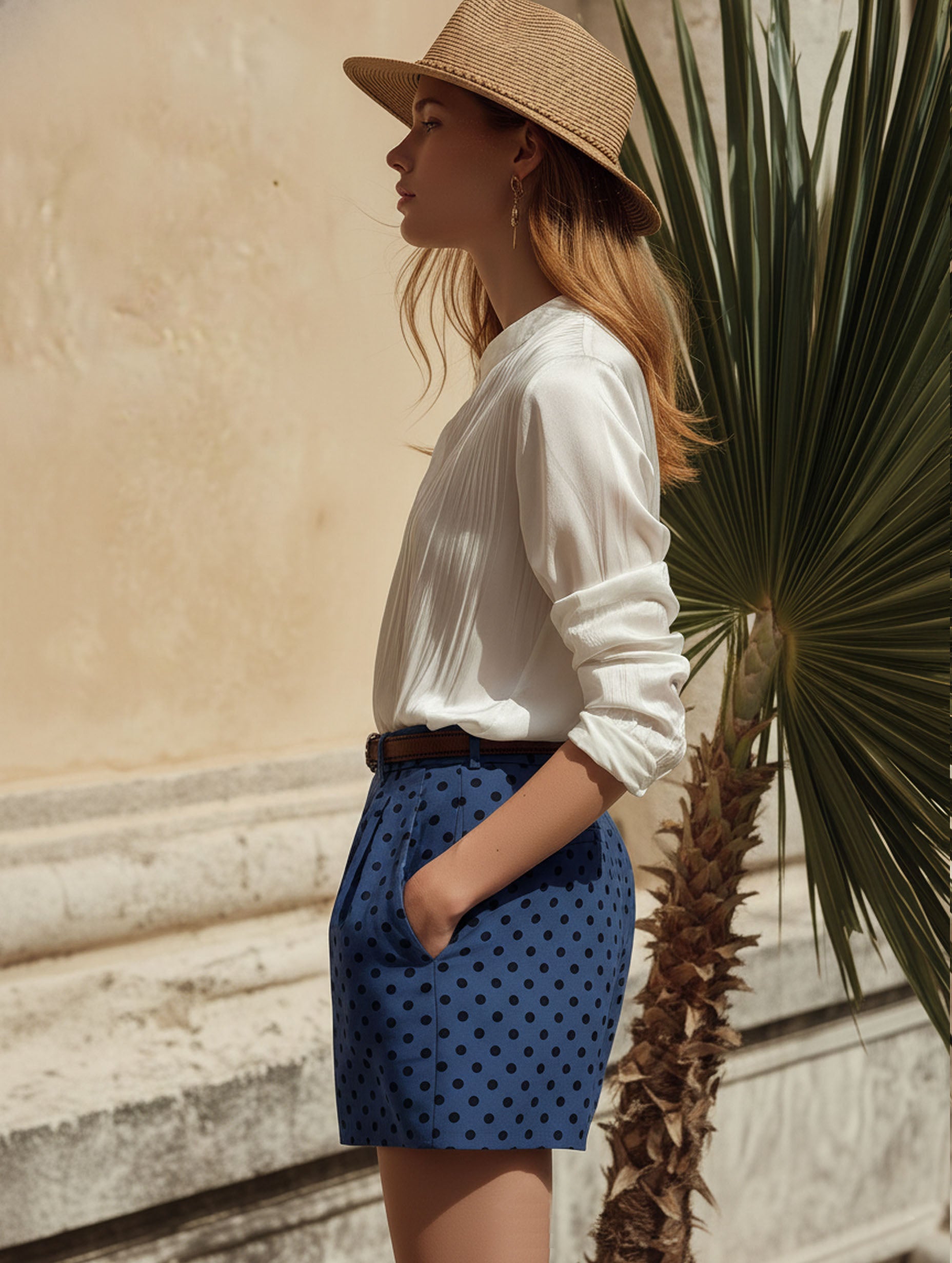 Vacation Beige Satin Pleated Top And Blue Tencel Polka Dot Print Shorts Set