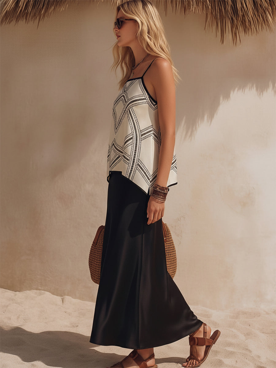 Bohemian Coast Geometric Print Satin Vest High-Waisted Black Satin Maxi Skirt Set