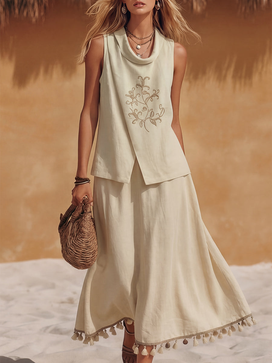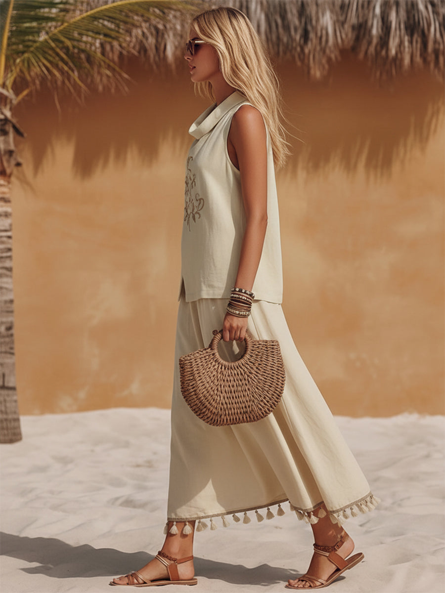 Bohemian Coast Sleeveless Beige Cotton Linen Draped Neck Embroidered Top And Tassel-Trimmed Cotton Linen Skirt Set