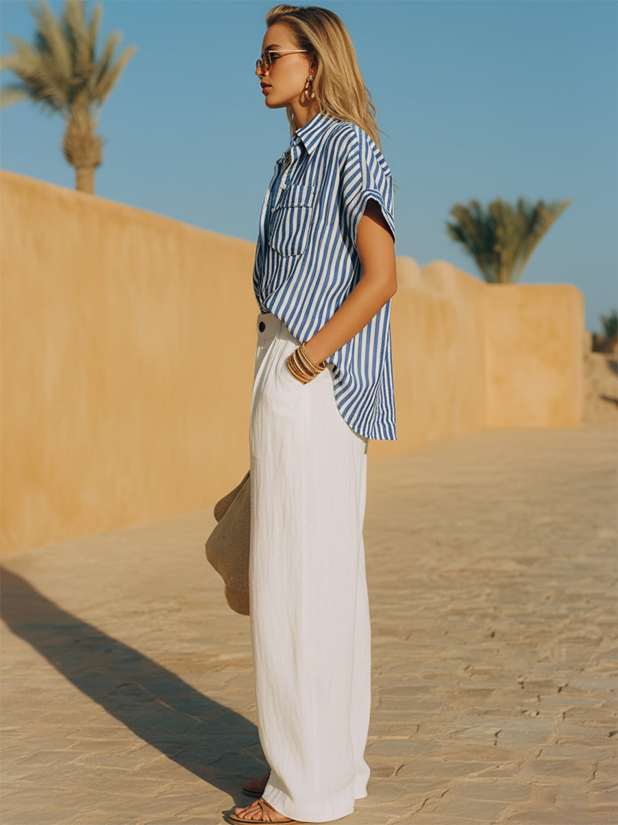 Coastal Style Blue And White Striped Shirt And White Loose-fitting Trousers Set