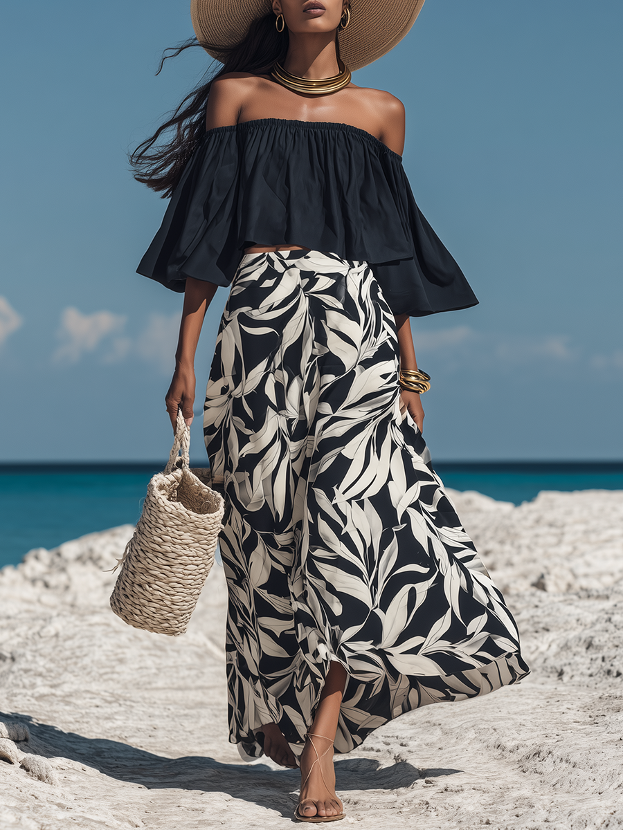 Romantic Bohemian Off-Shoulder Black Flared-Sleeve Top And Leaf-Print Chiffon Skirt Set