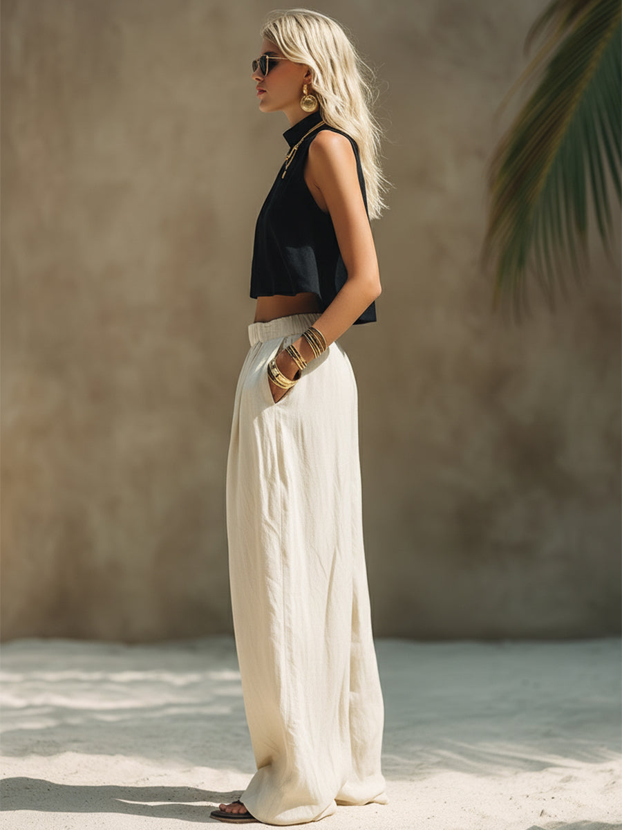 Casual Minimalist Black Cotton Linen Turtleneck Sleeveless Top And Off-white Loose-fitting Trousers Set