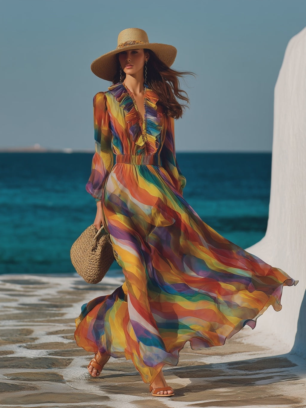 This romantic vacation‑style maxi dress radiates joy and elegance with its flowing rainbow‑print chiffon and graceful silhouette. The lightweight fabric drapes fluidly, catching the light with every step, while the V‑neckline adds a touch of soft allure. Gentle ruffles trace the neckline and hem, enhancing its movement and infusing the dress with playful, feminine energy.