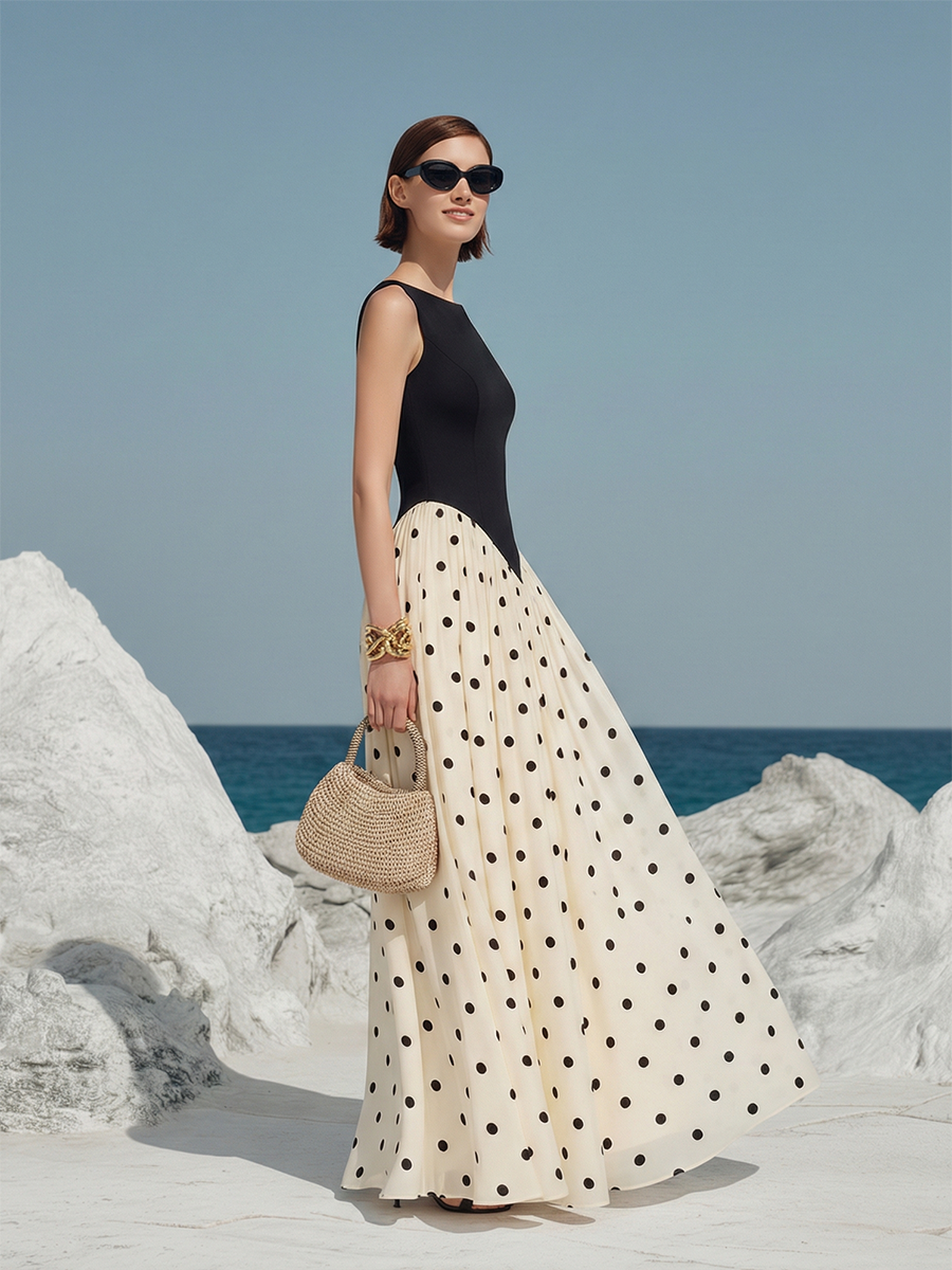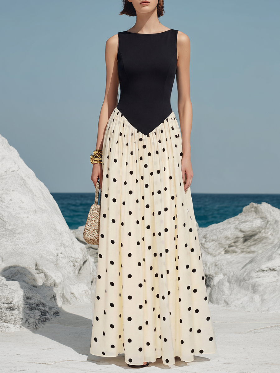 Elegant Vacation-style Black And White Polka Dot Sleeveless Maxi Dress
