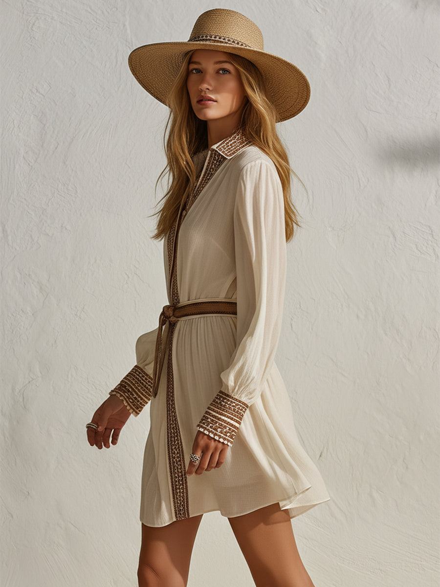 Bohemian Resort Chocolate Brown Embroidered Beige Mini Dress