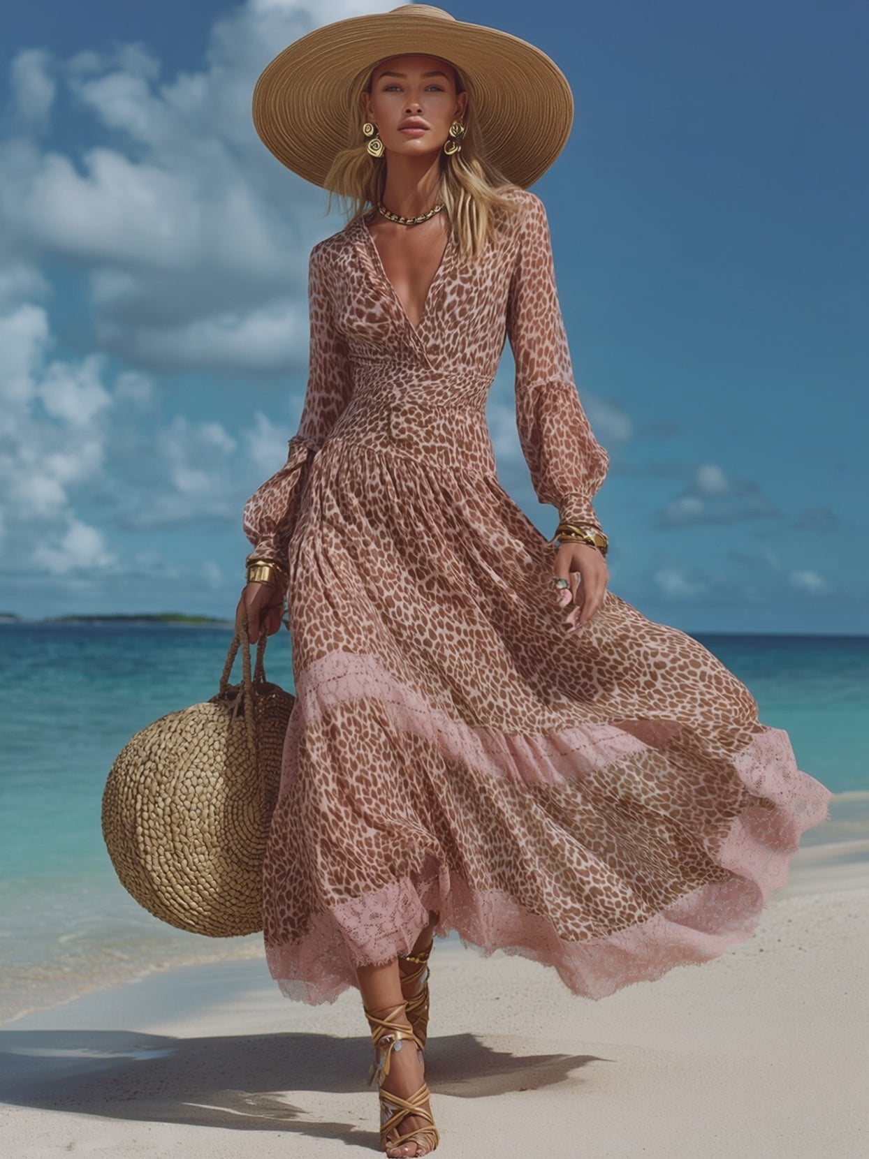 Vacation-chic V-neck Pink And Brown Leopard Print Chiffon Patchwork Lace Maxi Dress