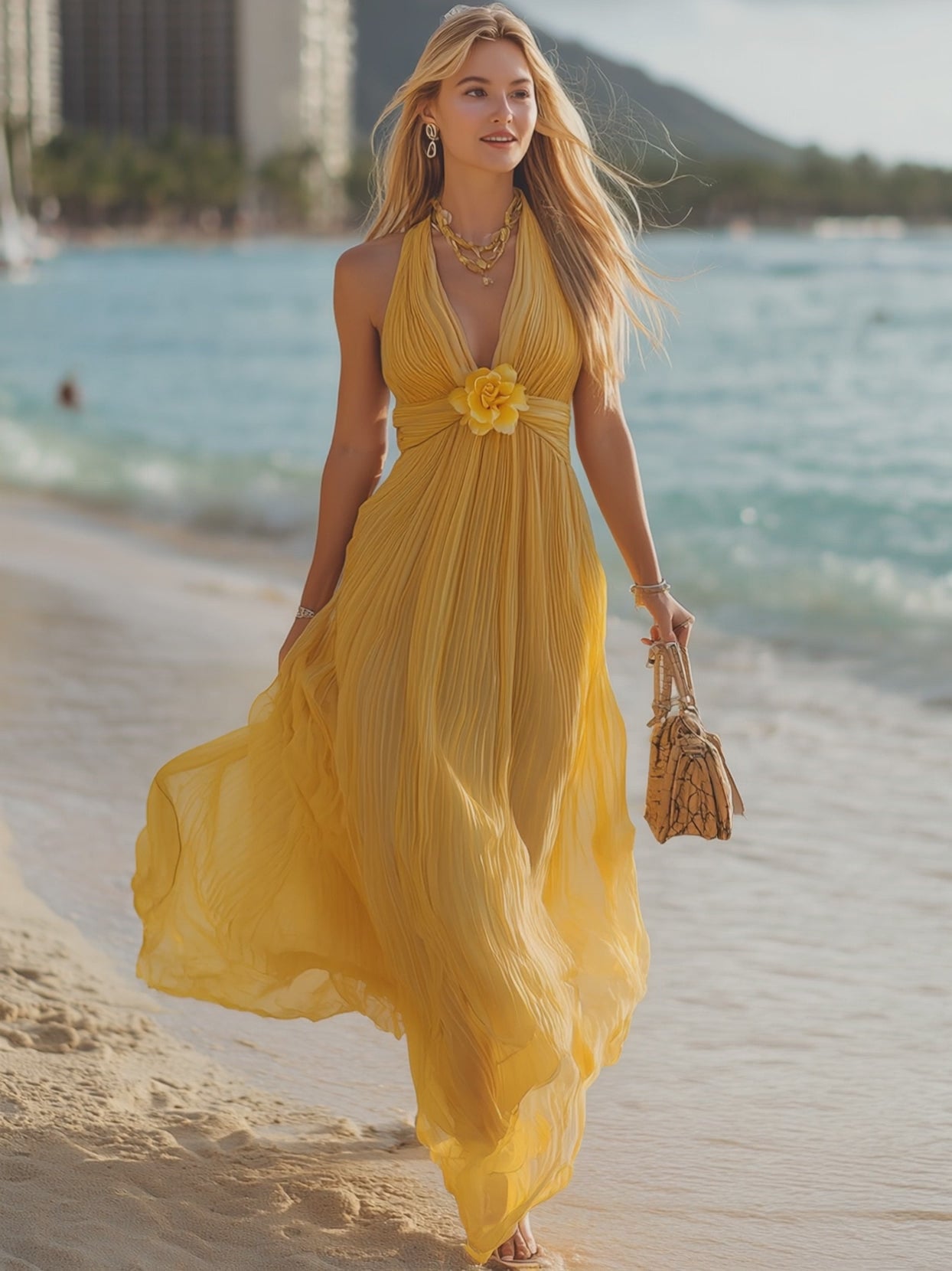 Bohemian Yellow Chiffon V-neck Halter Neck Pleated Maxi Dress