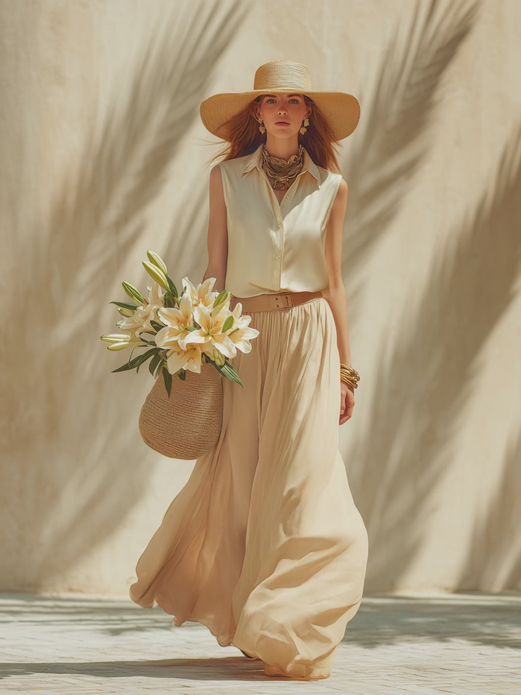 Perfect for warm-weather escapes, garden lunches, or seaside evenings, this coordinated set pairs wonderfully with minimalist jewelry, strappy sandals, and a woven clutch. Its soft color palette and fluid textures make it a statement of understated glamour — relaxed, radiant, and exuding timeless vacation sophistication.