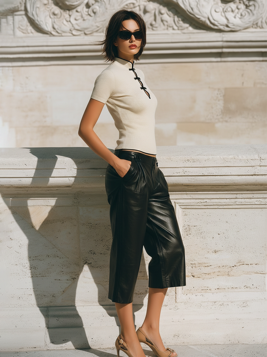 Stylish Black Trim And Black Frog Button Short-sleeved Knitted Top