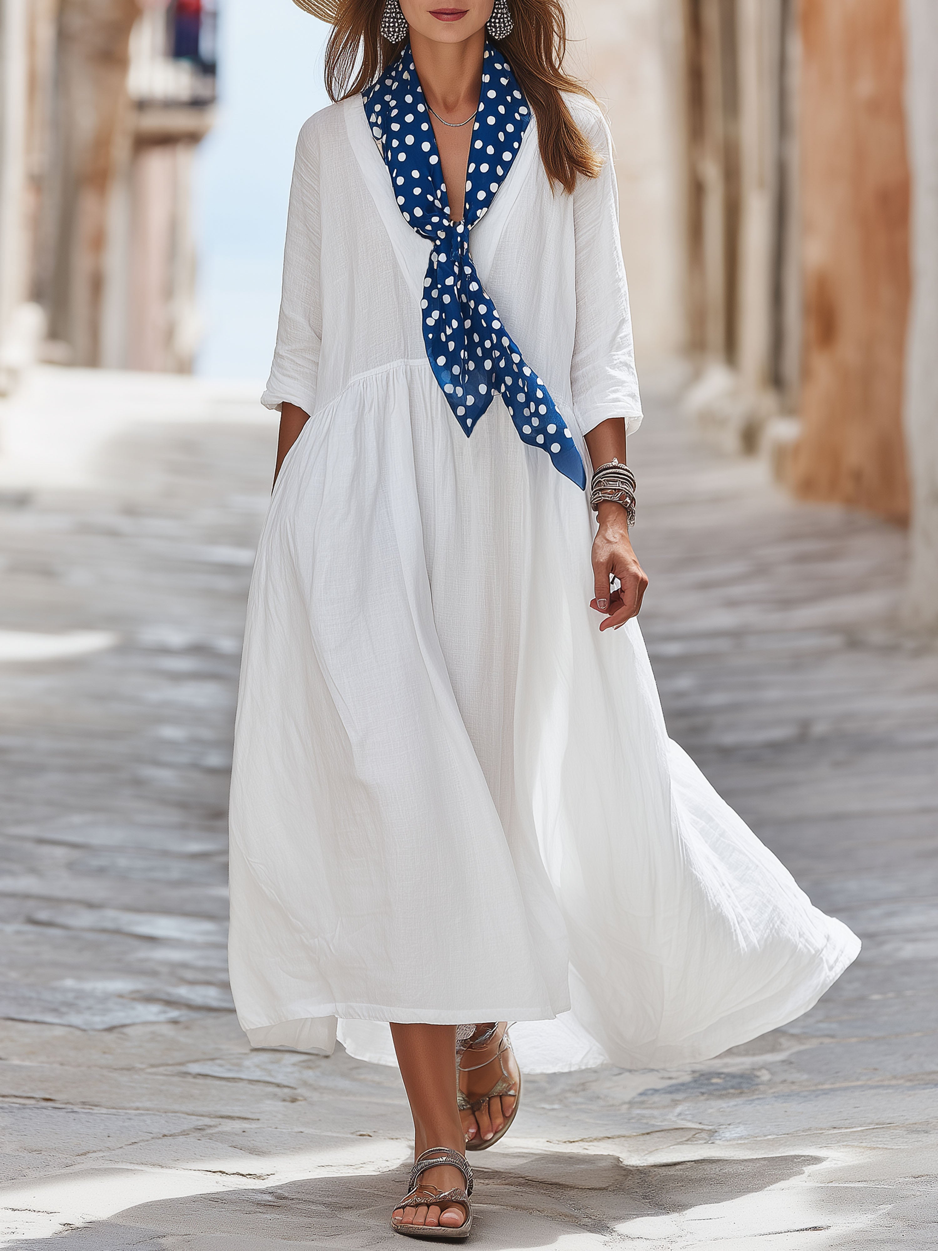 Elegant Blue Polka Dot Scarf And White Cotton Linen Mid-Sleeve Maxi Dress