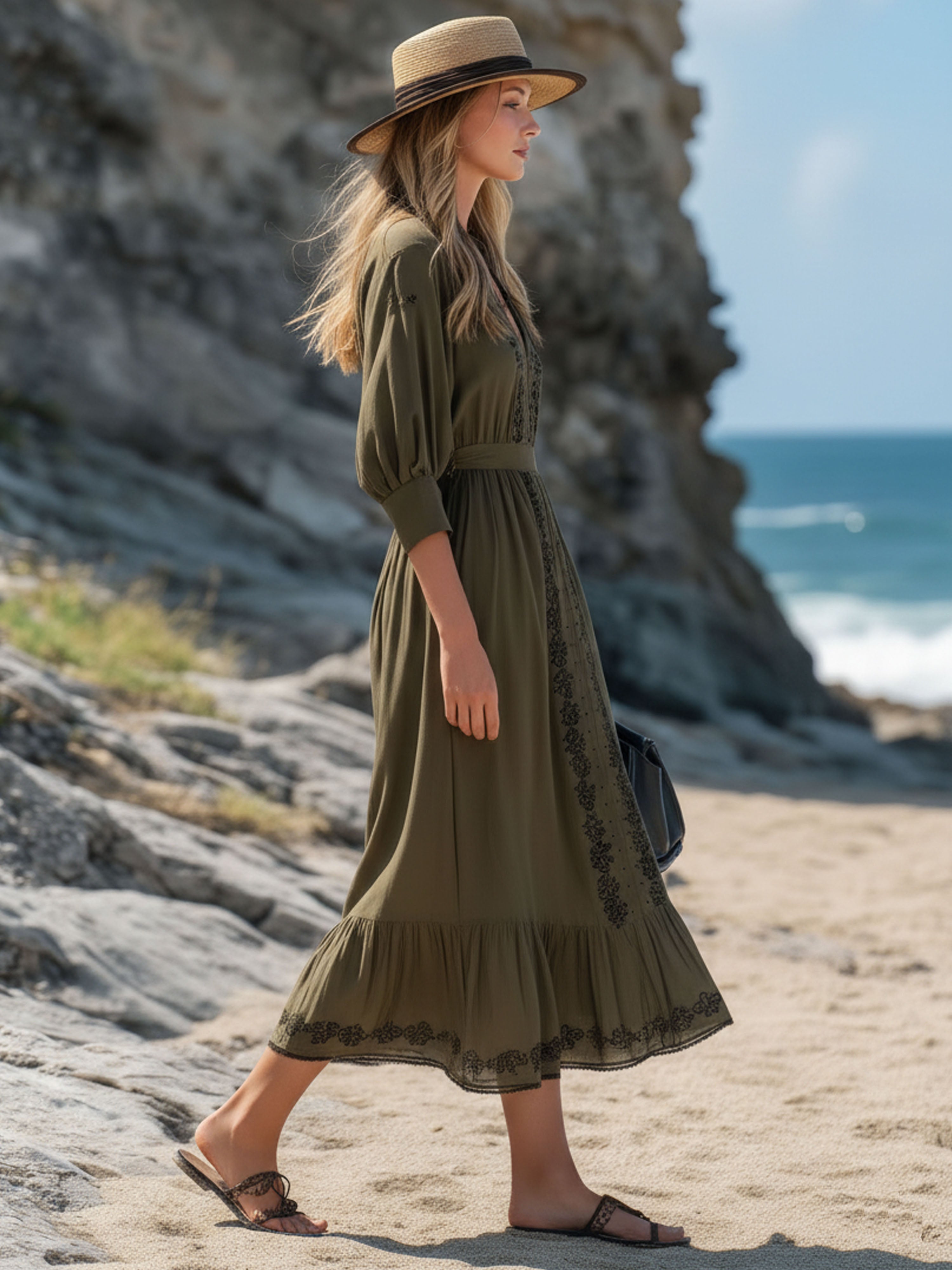 Resort-Style Ethnic-Inspired Cotton And Linen Embroidered Olive Green Maxi Dress