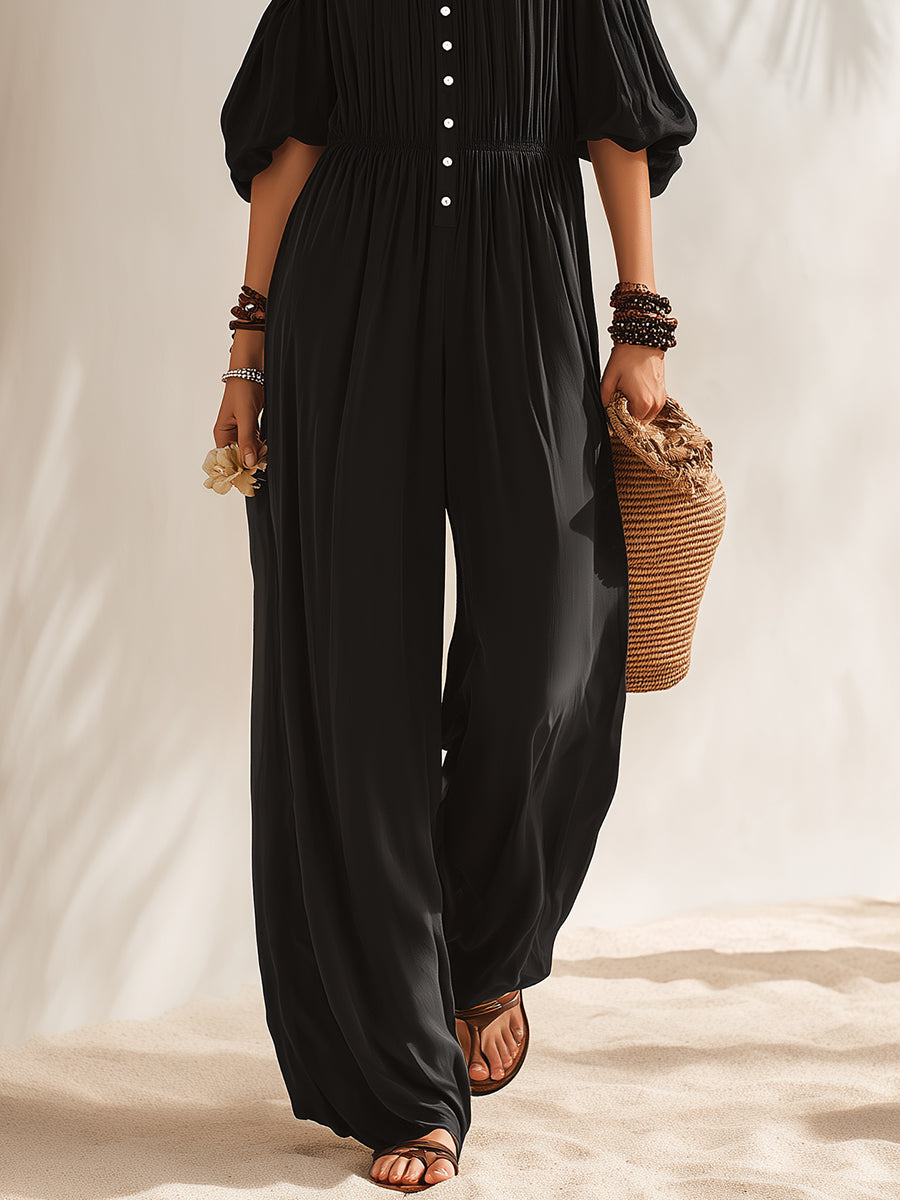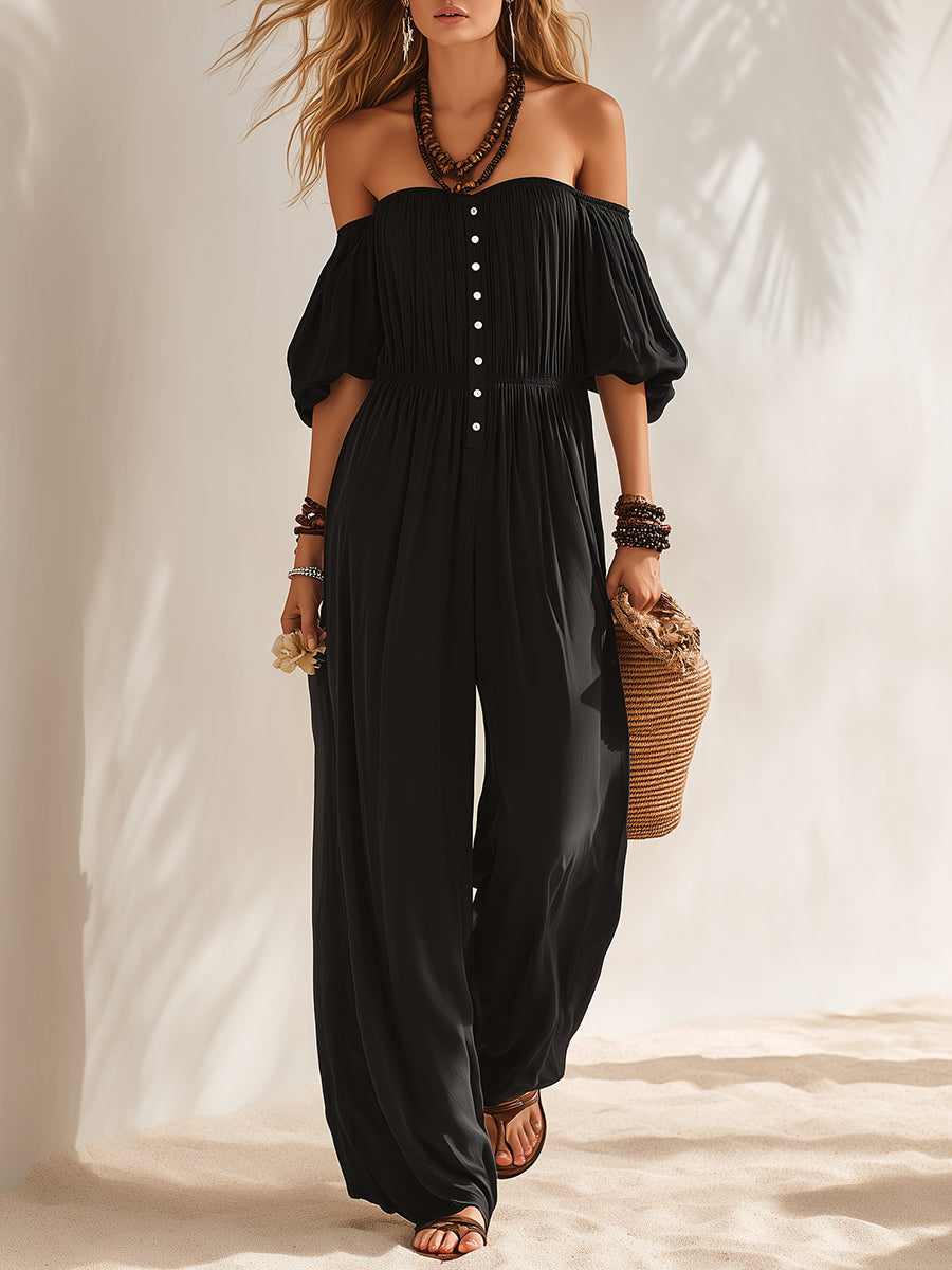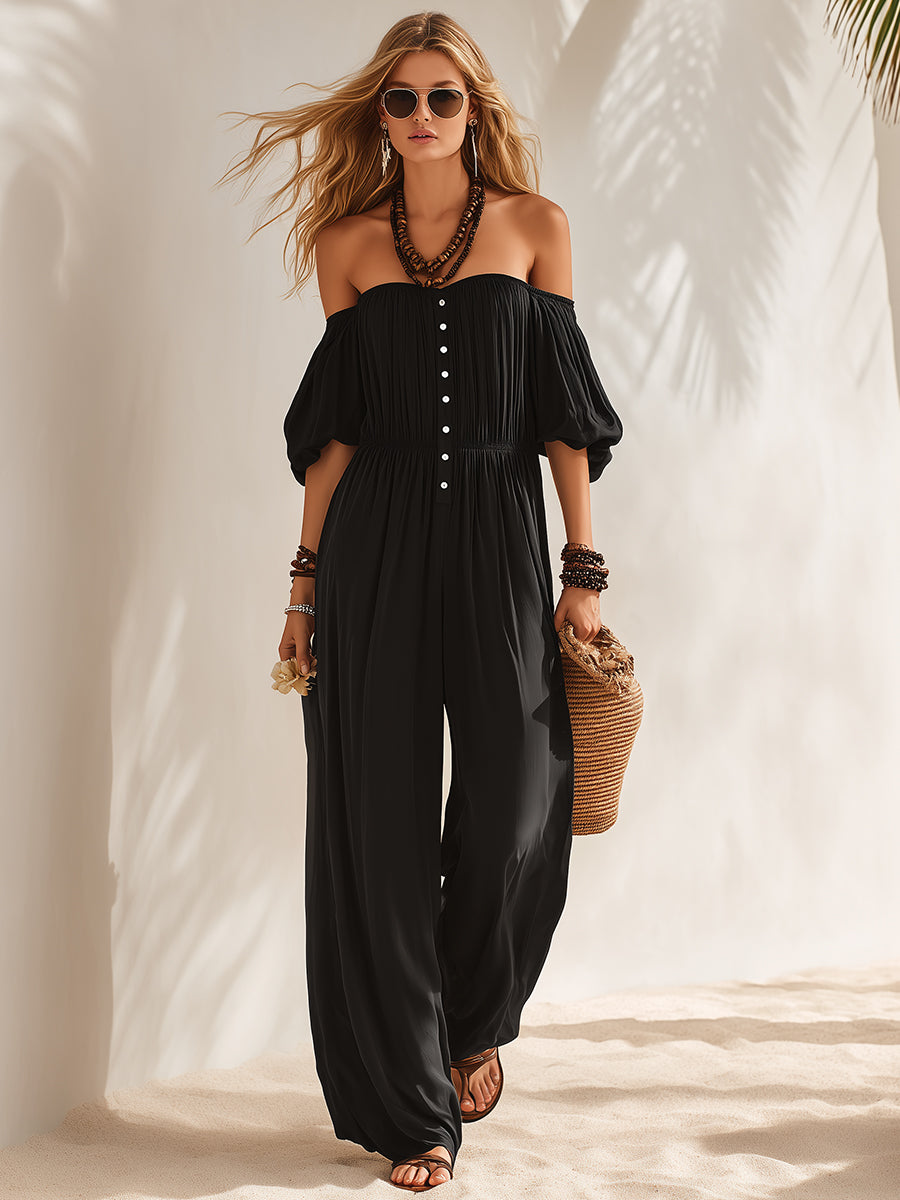 Bohemian Black Off-Shoulder Puff Sleeve Loose Jumpsuit